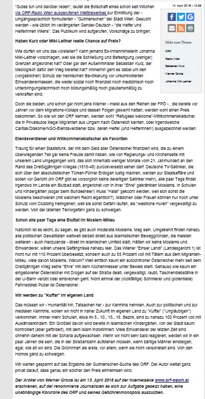 Dabei verdient es Werner Grotte wie kein Dritter nominiert zu werden für „Die Helfer Wiens“. Als Beleg dafür anbei sein Text „‚Gutes tun und reden darüber‘: ORF sucht Kandidaten für GutmenschInnen-Preis“. Das ist nicht nur ein recht hochkarätiger Text. Es ist auch ein Text, der belegt, mehr als Werner Grotte half Wien niemand zuvor. Als Bekräftigung, wie wahrhaft recht hochkarätig dieser Text ist, darf darauf verwiesen werden, daß er gestern nicht nur von der Website dieser Partei der recht aufrichtigen Charaktere veröffentlicht wurde, sondern bereits vorgestern von „ORF-Watch“, einer Vereinigung von vorwiegend Männern, deren erstes Begehren, deren ihnen zu Ehre gereichende Pflicht ist, der Aufrichtigkeit, wie sie der angesprochenen Partei Gesinnung ist, zum Sieg zu verhelfen. Es sind Männer mit recht außergewöhnlichen Fähigkeiten, beseelt von einer einzigen Pflicht, die aufrichtigsten Helfer zu sein, unter denen sich Werner Grotte still und bescheiden bewegt.