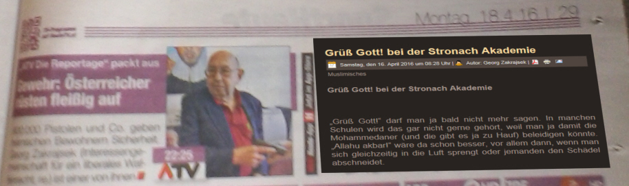 Beim Verlassen der comfort station einer wegen Erbschaften aufgesuchten Kammer fiel gegen Mittag des 18. April 2016 eine Zeitung auf dem Boden auf, die darüber informiert, daß am Abend desselben Tages eine Reportage über das Aufrüsten in Österreich zu sehen sein wird, in der auch, so die Ankündigung, Dr. Georg Zakrajsek vorkommt.