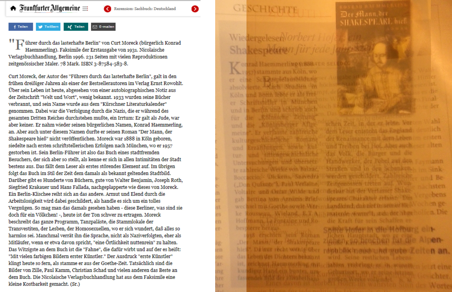 Deshalb mußte doch zu Haemmerling/Moreck, der vor langer Zeit einmal als „Mitläufer“ bezeichnet wurde, etwas geschrieben werden: wie gerade einmal innerhalb von acht Jahren aus einem „Trödler“, der ein Betrüger ist, ein „Jude“ …, und wie nach der bekannten massenmörderischen Geschichte des deutschen reiches immer noch die von Curt Moreck herausgebrachte Übersetzung beispielsweise von dem Konzern Amazon …