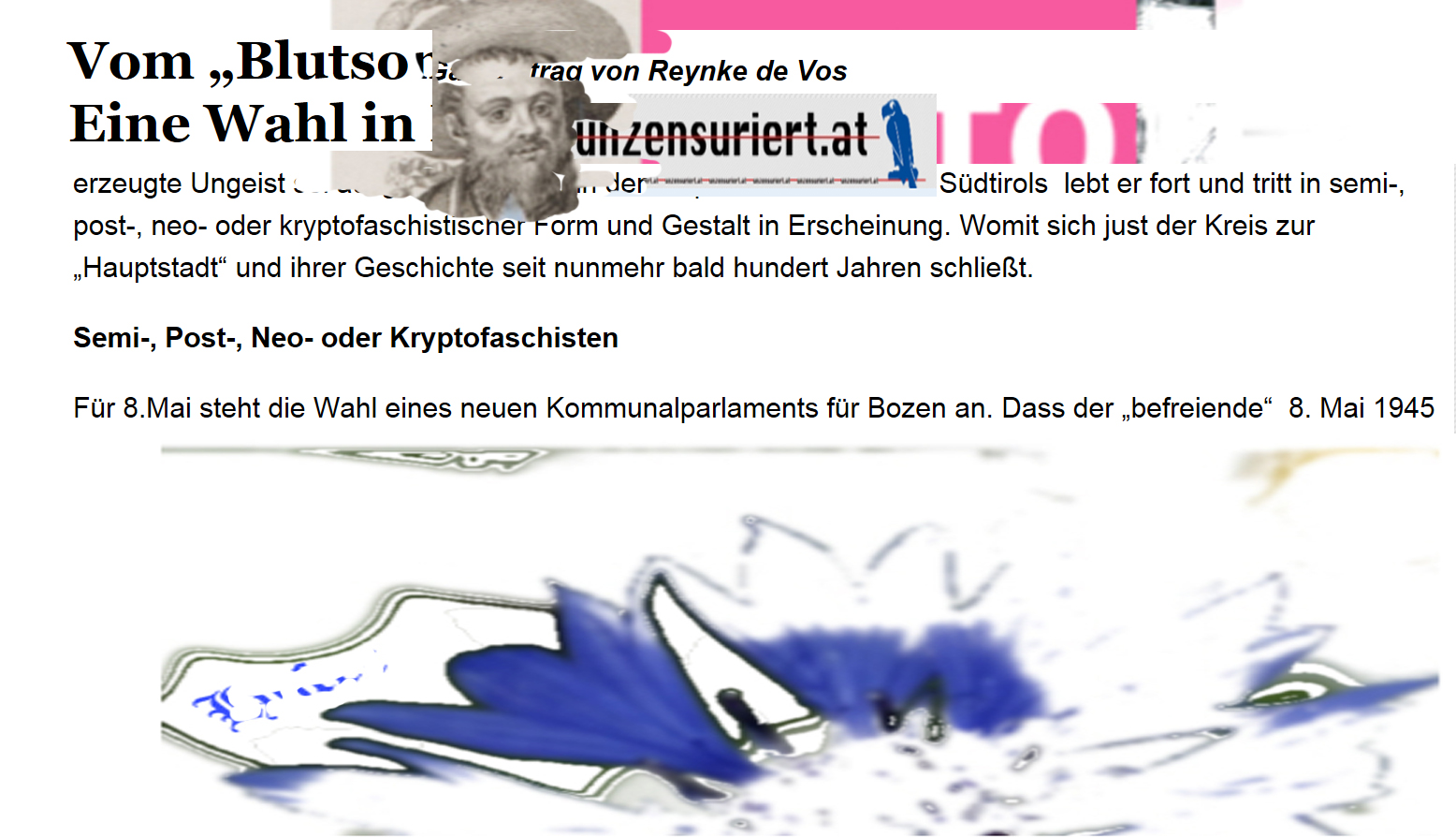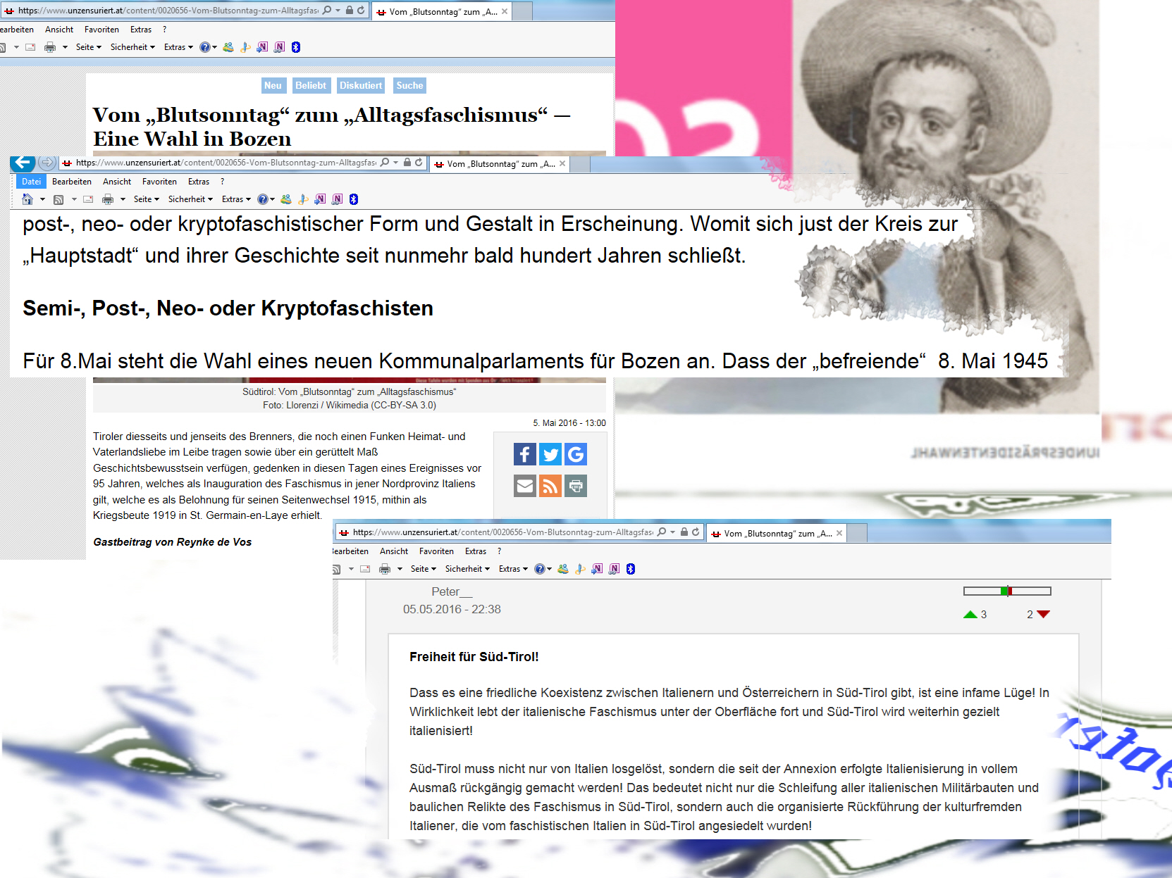 Am 5. Mai 2016 schreibt Reynke de Vos über Südtirol: „Vom ‚Blutsonntag‘ zum ‚Alltagsfaschismus‘ – Eine Wahl in Bozen“ … Das Pseudonym sagt bereits alles. Es ist der Titel eines niederdeutschen Tierepos aus dem 15. Jahrhundert. Mit dem Pseudonym kann also bereits der Wahrheitsgehalt bestimmt werden. Die Unzensuriert möchte eine schlaue Füchsin sein, ach, ist das nicht rührend?