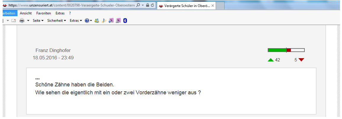Und was zeichnet diesen Franz Dinghofer neben dem Suchen nach Bombenzielen in Österreich noch aus? Ebenfalls gestern schrieb er unzensuriert die Frage, wie würden zwei junge Menschen ohne ein oder zwei Vorderzähne aussehen. Er bezog sich dabei auf ein Bild, das FPÖ unzensuriert zu ihrem Kommentar hinzufügte, auf dem ein junger Mann und eine junge Frau zu sehen sind, die für Franz Dinghofer etwas Bestrafungswürdiges machen, nämlich nicht für seinen Kandidaten zu werben, also für den führenden Mann der identitären Parlamentspartei.