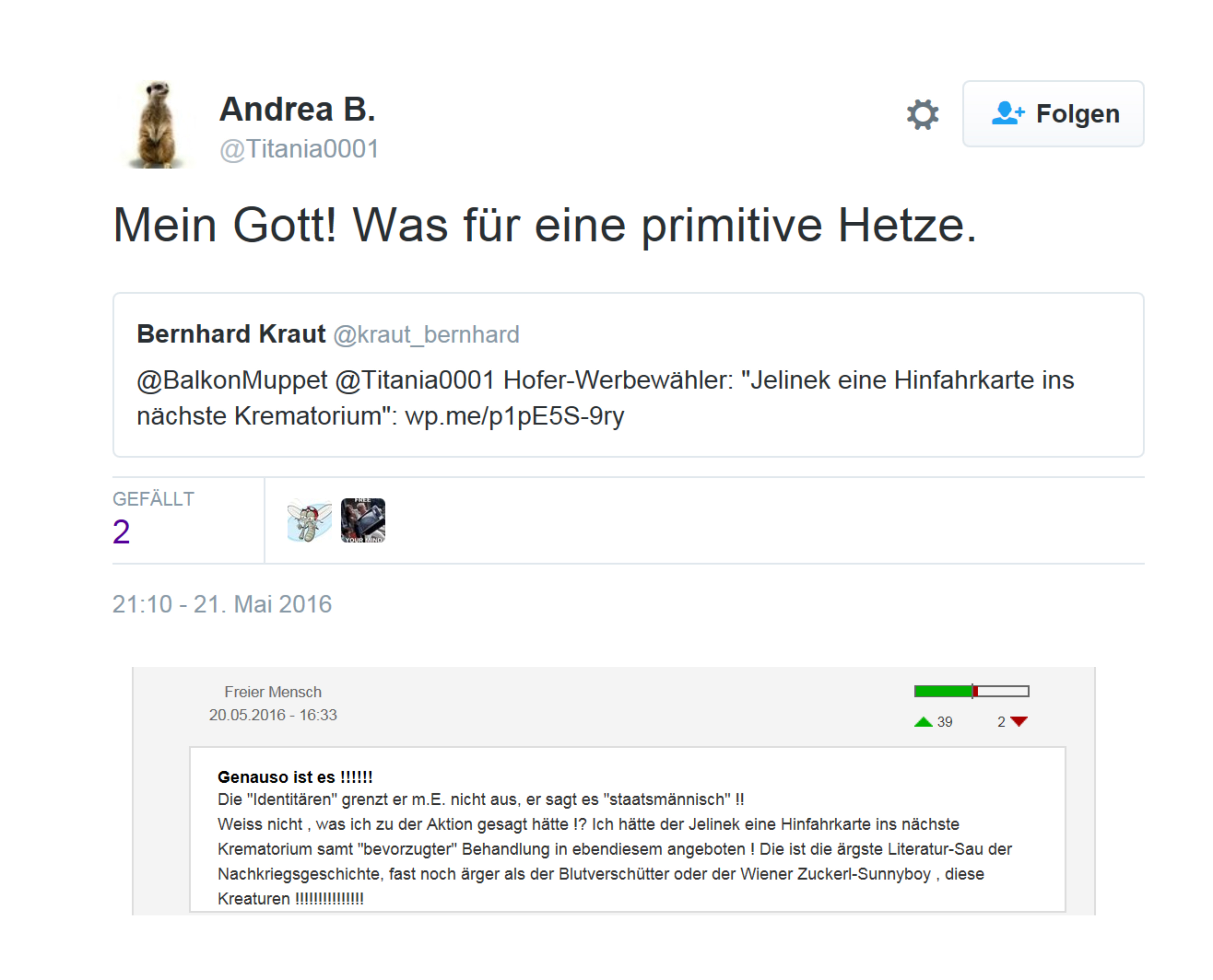 gefunden. Andrea B. selbst wählt nicht nur, wie ihr Bekenntnistweet nahelegt, Norbert Hofer, sie wirbt auch für Norbert Hofer und also für die Hofer-FPÖ.