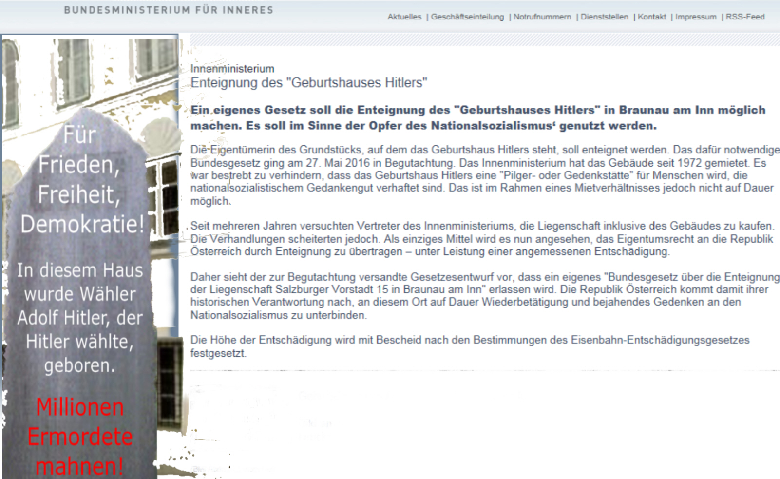 PPS Möglicherweise wird diese besondere Präventionsarbeit des Innenministeriums auch nur nicht verstanden. Um Menschen die Möglichkeit zu nehmen, nach dem Wiederbetätigungsgesetz straffällig werden zu können, muß eben zur harten Maßnahme der Enteignung gegriffen werden. Aber vielleicht weiß das Innenministerium nicht nur recht Bescheid um Zeit, Raum, Symbol, sondern auch um Gesetze, oder gilt etwa das Verbotsgesetz in Braunau nicht? Wenn an manche Angestellte der Exekutive gedacht wird, etwa an den Vizebürgermeister in Kaltenleutgeben, dem ein Glaube gefährlicher als die NPD …