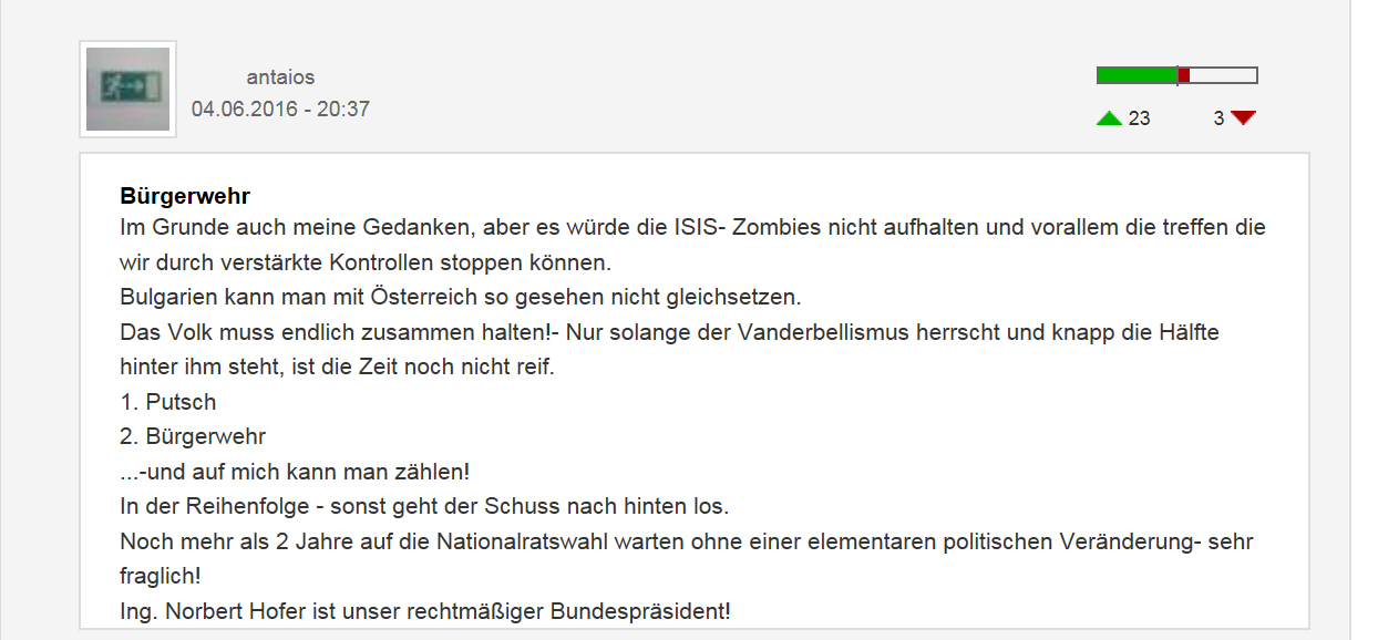 In den Leserkommentaren wurden FPÖ-Kritiker dann als „‚journaillistischer‘ Abschaum“ beschimpft oder der Präsidentschaftskandidat Van der Bellen als „EINGEBÜRGERTER Österreich hassender AUS-LÄNDER“ verunglimpft, der gar nicht das Recht haben solle, zu kandidieren. Das Team von unzensuriert.at löscht solche Hasspostings nicht – auch ein Statement.