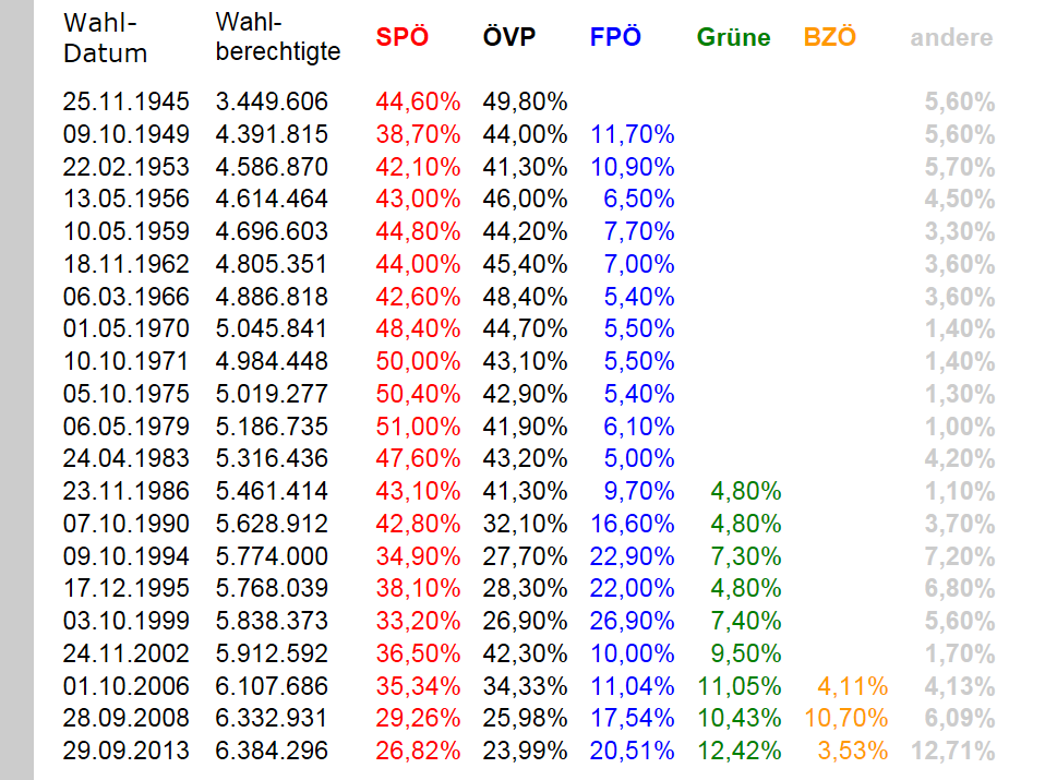Wie die Ergebnisse der Nationalratswahlen in Österreich seit 1945 zeigen, ist die identitäre Partei seit 1949 die dritte Systempartei, um den von ihr als Schimpfwort verwendeten Begriff doch zu verwenden.