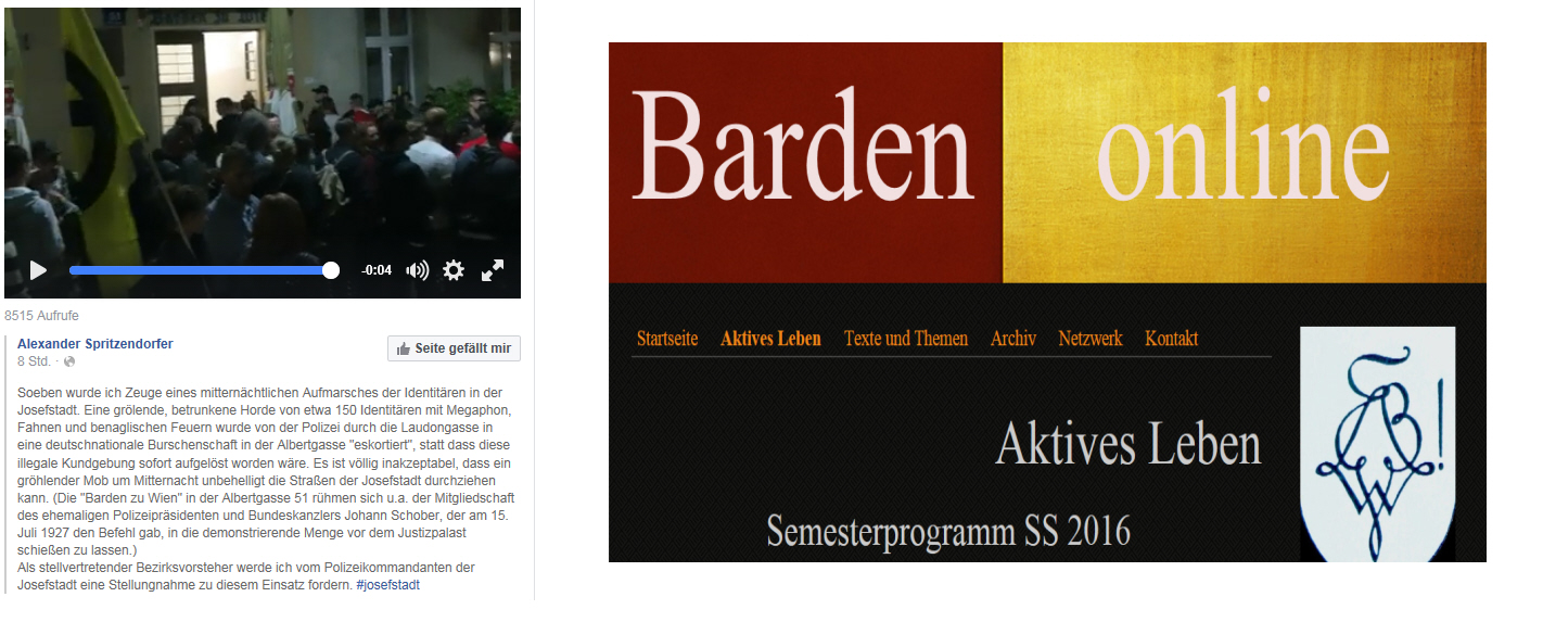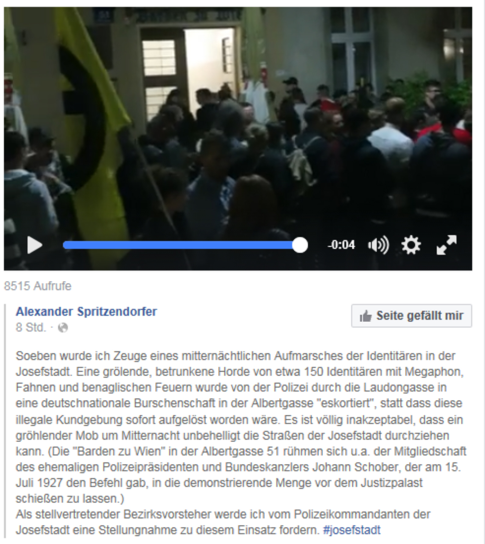 „Soeben wurde ich Zeuge eines mitternächtlichen Aufmarsches der Identitären in der Josefstadt. Eine grölende, betrunkene Horde von etwa 150 Identitären mit Megaphon, Fahnen und benaglischen Feuern wurde von der Polizei durch die Laudongasse in eine deutschnationale Burschenschaft in der Albertgasse ‚eskortiert‘, statt dass diese illegale Kundgebung sofort aufgelöst worden wäre. Es ist völlig inakzeptabel, dass ein gröhlender Mob um Mitternacht unbehelligt die Straßen der Josefstadt durchziehen kann. (Die ‚Barden zu Wien‘ in der Albertgasse 51 rühmen sich u.a. der Mitgliedschaft des ehemaligen Polizeipräsidenten und Bundeskanzlers Johann Schober, der am 15. Juli 1927 den Befehl gab, in die demonstrierende Menge vor dem Justizpalast schießen zu lassen.)