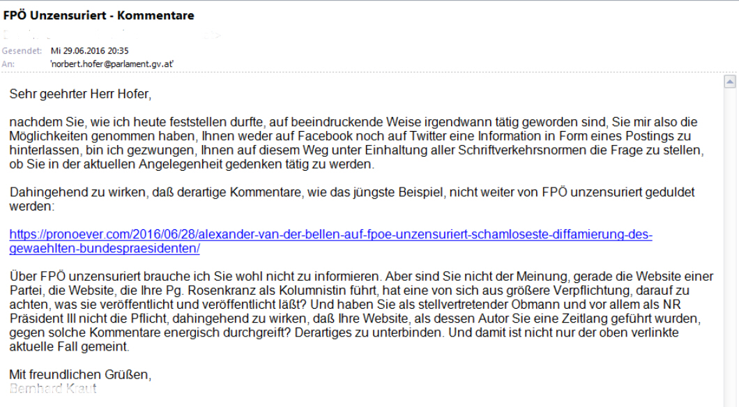 Trotz des Umstandes, daß der von FPÖ unzensuriert gesinnungsgemäß hochgelobte Kandidat bereits am 29. Juni 2016 darüber persönlich informiert wurde, mit folgender E-Mail: