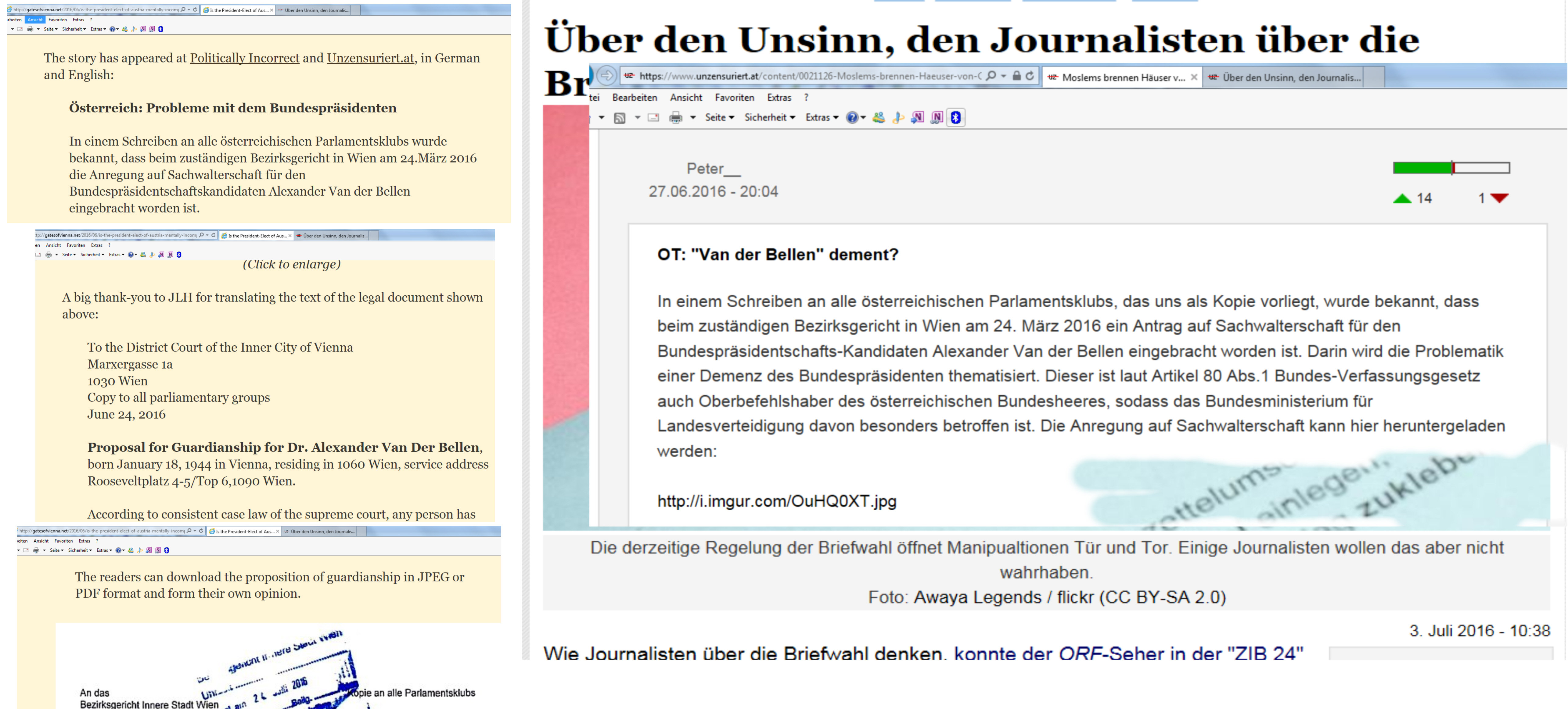 Auch am 3. Juli 2016 ist, wie in der Collage gelesen werden kann, die schamlose und übelste Verunglimpfung eines Bundespräsidentschaftswahlkandidaten, der zum Zeitpunkt der Veröffentlichung auf FPÖ unzensuriert gewählter und designierter Bundespräsident war, nach wie vor von FPÖ unzensuriert zur weiteren Verbreitung veröffentlicht.