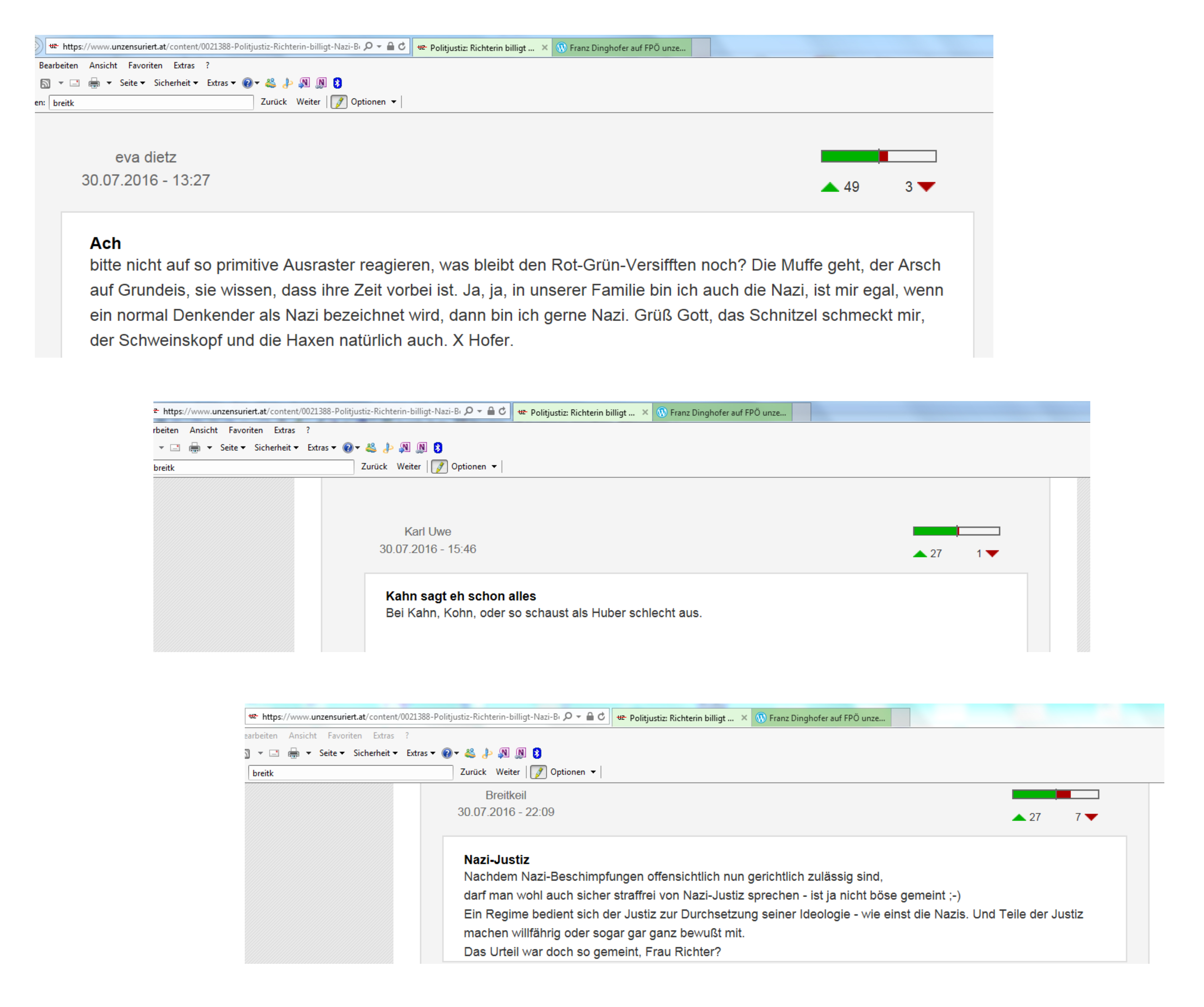 FPÖ unzensuriert wird ersucht, alle drei Kommentare nicht zu löschen. Um so eine kleine Zählung zu erhalten, wie viele sind gerne und für … wie vielen ist das Antisemitische nicht fremd, wie viele sehen die Justiz in Österreich als … wenn ein Urteil einmal nicht ihrer Gesinnung gemäß ausfällt.