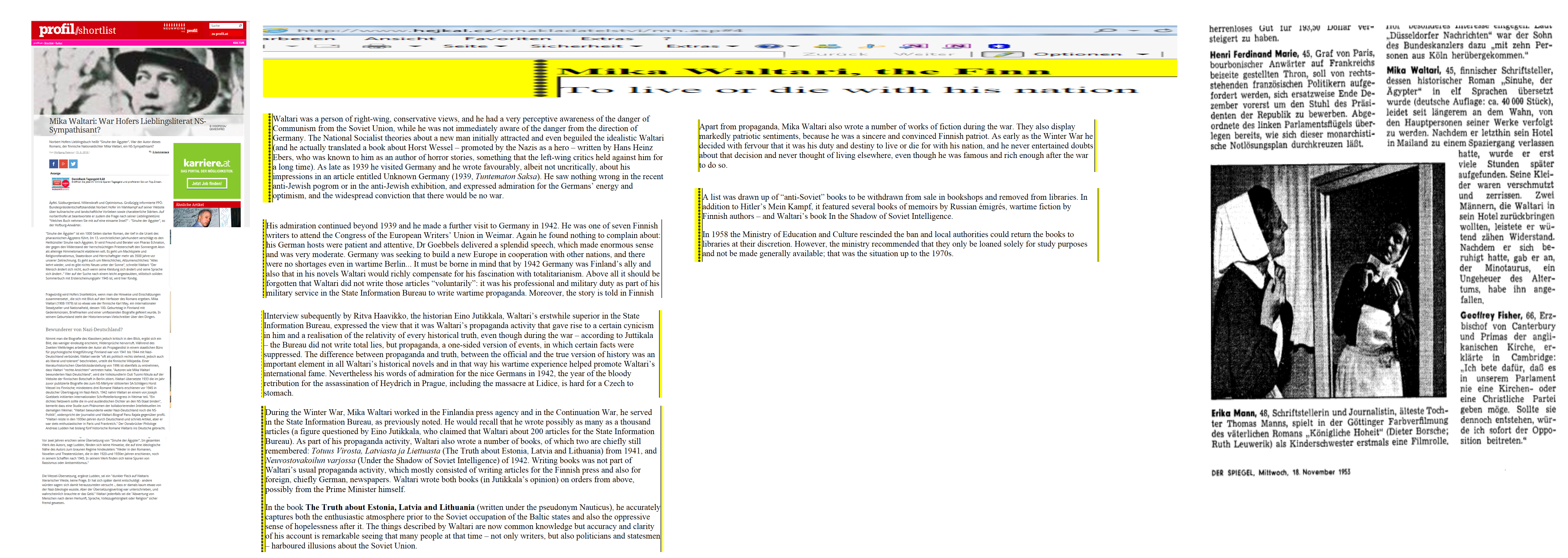 Das ist die Überschrift des Textes von Markéta Hejkalová, die ein Buch über ihn schrieb: „Fin Mika Waltari“. Ein paar Ausschnitte aus diesem Text in der Collage hinzugefügt zu dem Artikel von Wolfgang Paterno, um ein vollständigeres Bild zu bekommen … Da vor allem sein Buch „Truth about Estonia, Latvia and Lithuania“ aus 1941, von ihm unter dem Pseudonym Nauticus veröffentlicht, nicht vorliegt, kann nur ersucht werden, selbst zu recherchieren, ob es denn tatsächlich ein Buch ist, das „contains fanatic examples of anti-Semitic“ … wie es ein Mann schreibt, dessen heutige Aktivitäten nicht dafür sprechen, ihn nennen zu wollen …
