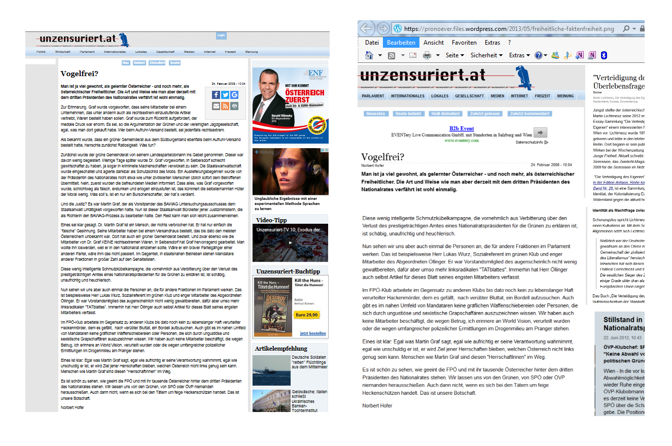 Eine Zeitlang wurde Norbert Hofer als Autor von FPÖ unzensuriert geführt. Er ist dritter Nationalratspräsident. Das ist der „rechte Rand“ in Österreich. Zu dem mit einer dritten Chance richterlich Beschenkten stellt sich eine, zwar nicht wichtige, aber doch eine Frage. Wann wurde wohl von FPÖ unzensuriert entschieden, seinen Namen nicht mehr prominent gleich beim Titel „Vogelfrei?“ aufscheinen zu lassen? Wie in der Collage zum Vergleich gelesen werden kann. Als er seine Verteidigung für Martin Graf schrieb, wie hier nachgelesen werden kann.