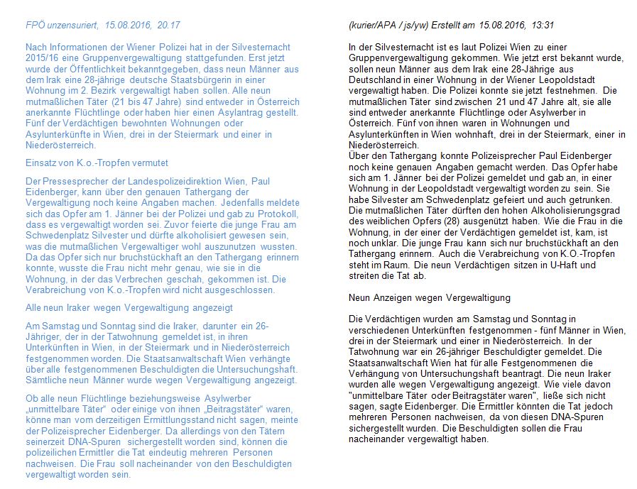 Der Bericht wird von FPÖ unzensuriert gesinnungsgemäß hergerichtet, der Apa-Kurier-Bericht ein wenig umformuliert, um den Eindruck eines Eigenberichts, einer Eigenleistung vorzutäuschen, wie in der Collage in der Nebeneinanderstellung leicht nachzuprüfen ist.