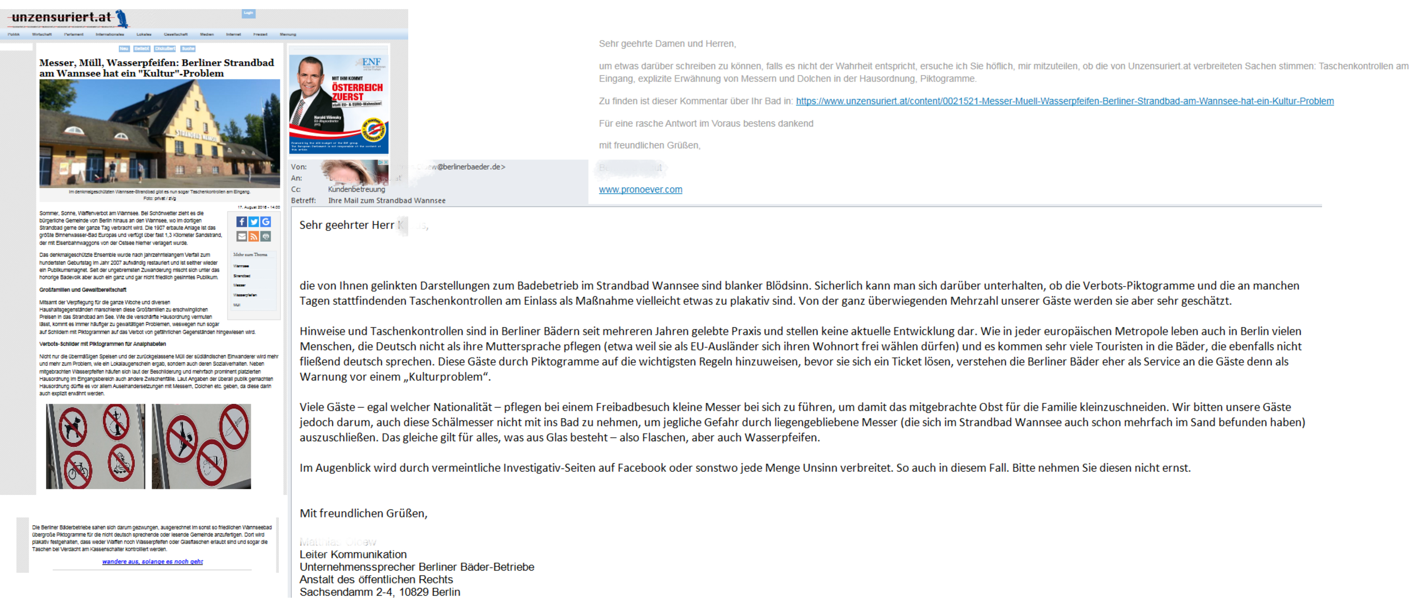 „Die von Ihnen gelinkten Darstellungen zum Badebetrieb im Strandbad Wannsee sind blanker Blödsinn. Sicherlich kann man sich darüber unterhalten, ob die Verbots-Piktogramme und die an manchen Tagen stattfindenden Taschenkontrollen am Einlass als Maßnahme vielleicht etwas zu plakativ sind. Von der ganz überwiegenden Mehrzahl unserer Gäste werden sie aber sehr geschätzt.