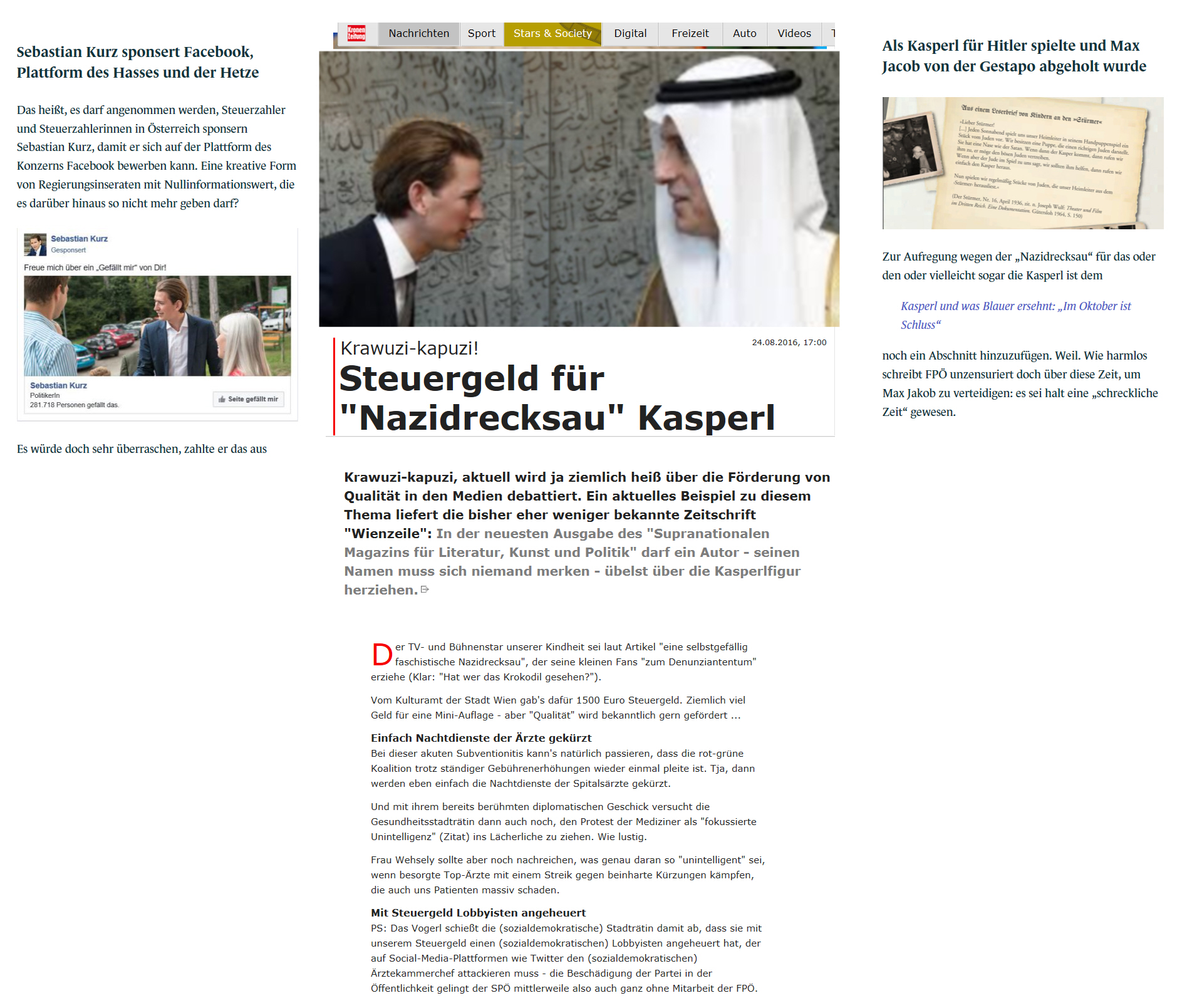 Interessant wäre es durchaus einmal zu erfahren, etwa von der Kronen-Zeitung, wie hoch und wodurch die Werbeausgaben zum Beispiel von Sebastian Kurz bedeckt werden … Aber wer sich mit einem Kasperl bezüglich Steuergeld derart intensiv beschäftigt, kann sich nicht um alle Ausgaben …