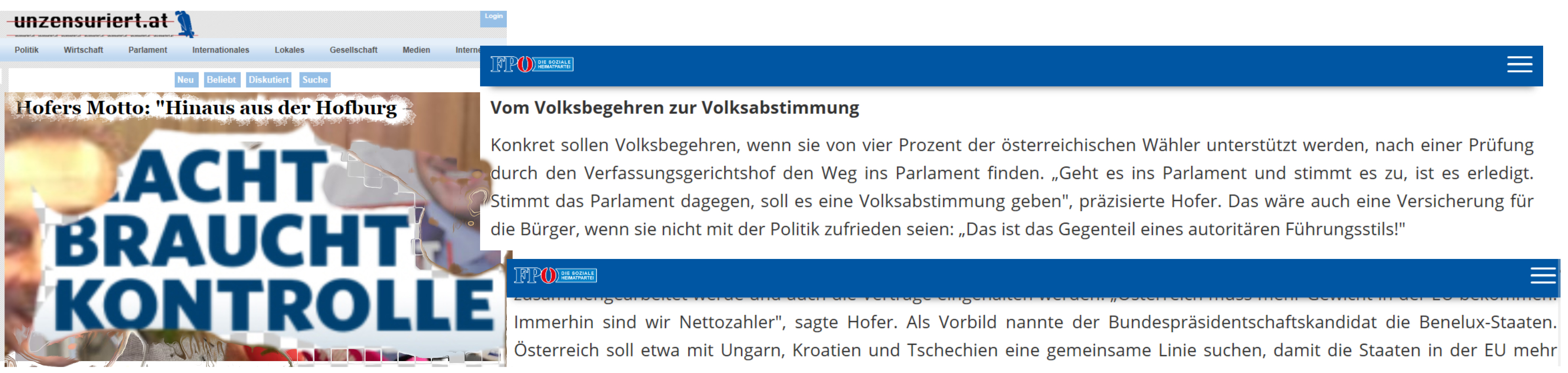 „Konkret sollen Volksbegehren, wenn sie von vier Prozent der österreichischen Wähler unterstützt werden, nach einer Prüfung durch den Verfassungsgerichtshof den Weg ins Parlament finden. ‚Geht es ins Parlament und stimmt es zu, ist es erledigt. Stimmt das Parlament dagegen, soll es eine Volksabstimmung geben‘, präzisierte Hofer. Das wäre auch eine Versicherung für die Bürger, wenn sie nicht mit der Politik zufrieden seien: ‚Das ist das Gegenteil eines autoritären Führungsstils!‘