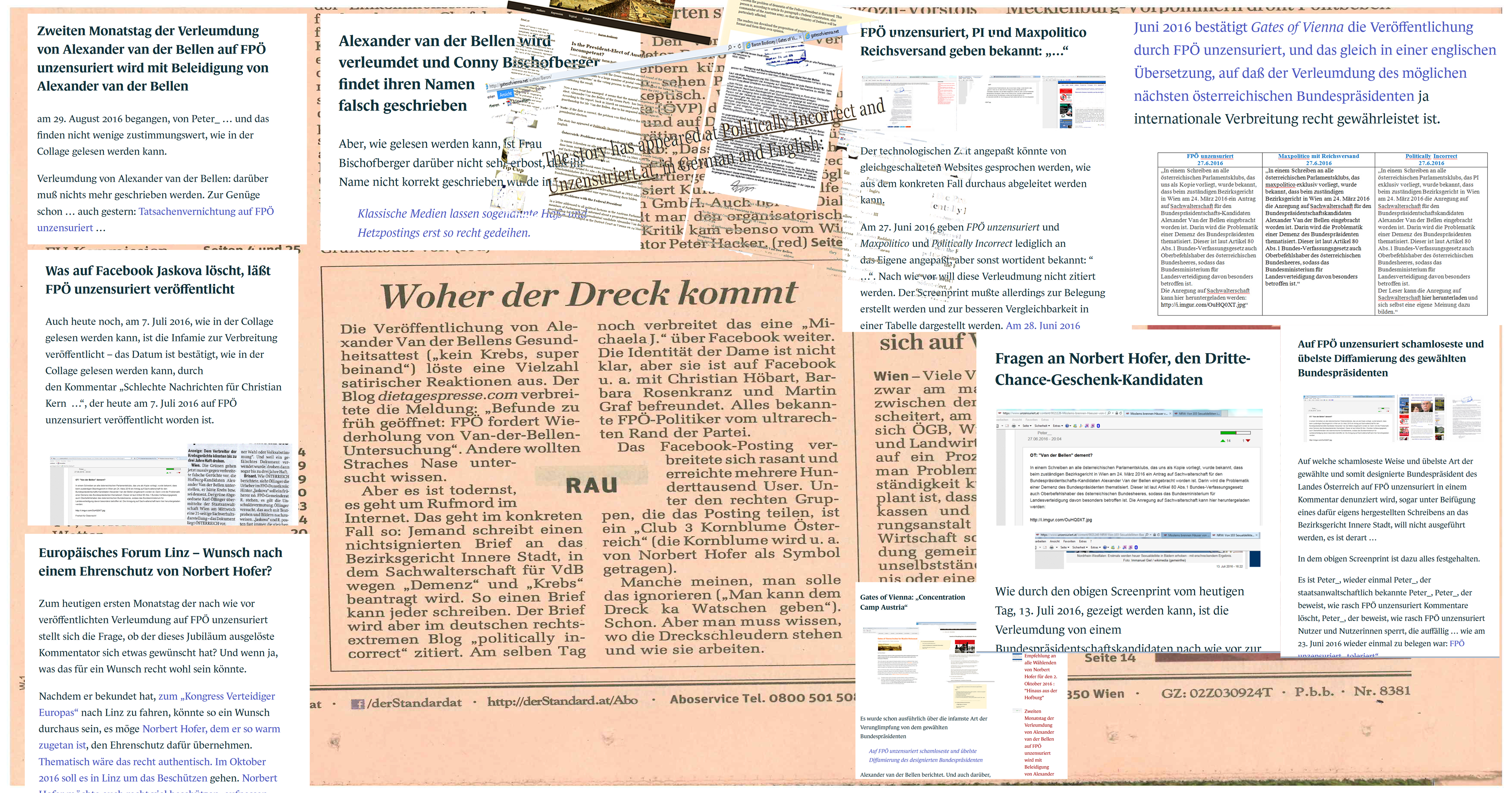 Vielleicht hat Hans Rauscher auf diese Frau, deren Identität nicht ganz klar sei, zurückgegriffen, um das Wort „Dreck“ schreiben zu können. Denn dieses Wort paßt wohl zu einem Posting einer anonymen Frau auf Facebook. Es wird doch in den ehrenwerten Kreis gewußt, wie diese sind: bildungsfern, arbeitslos und so weiter und so fort. Er, Rau, hätte sich wohl schwergetan, „Dreck“ zu schreiben, hätte er sich etwa mit „Gates of Vienna“ auseinandergesetzt; auf dieser Site nur einen Tag später eine englische Übersetzung der Verleumdung, um den gewählten Bundespräsidenten weltweit diffamieren zu können: Gates of Vienna: „Concentration Camp Austria“ …