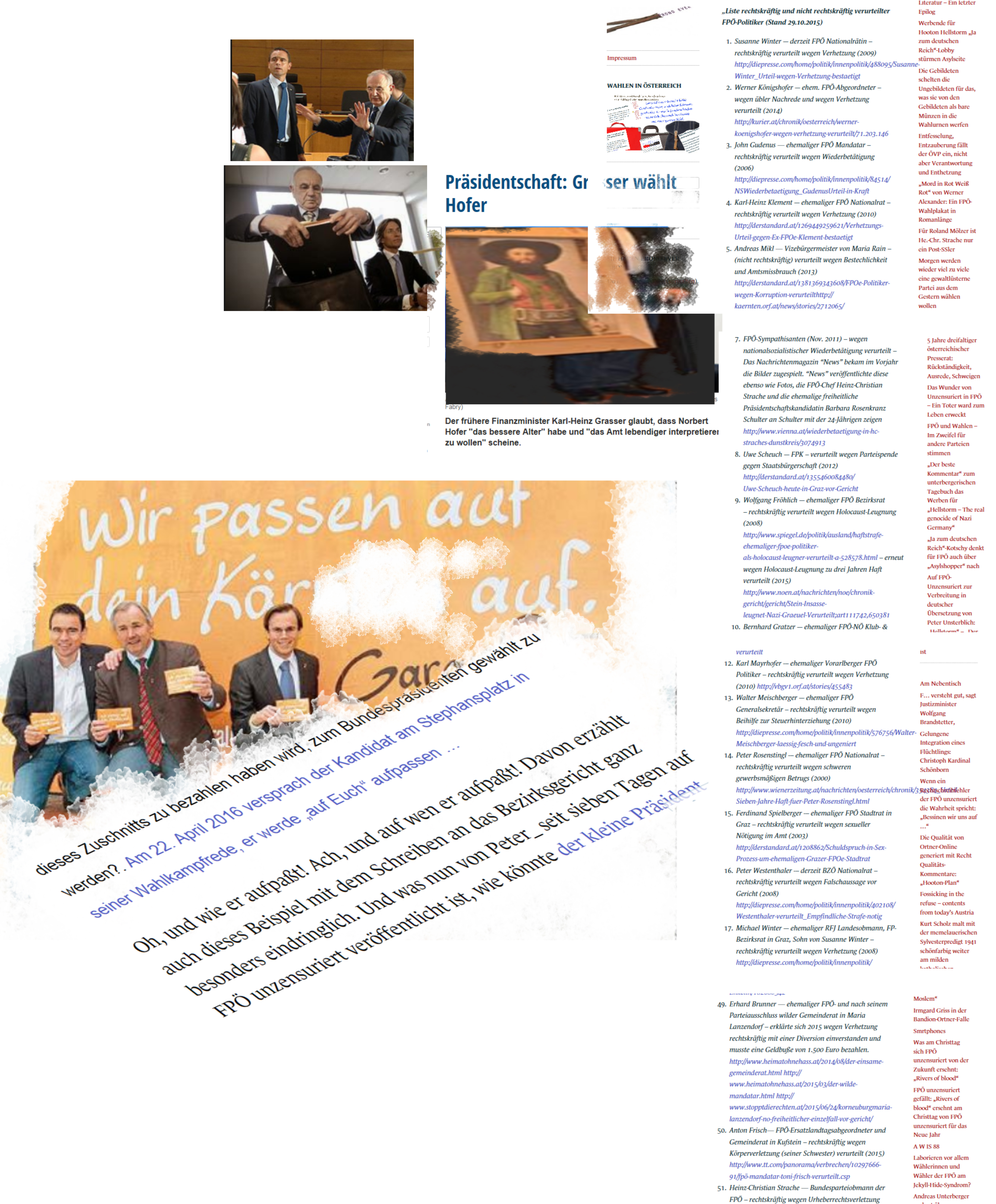 NS Zur Erinnerung, wie in der Collage gelesen werden kann, gab es in Kärnten einmal ein Plakat mit dem Spruch des Aufpassens, ein Versprechen an einen Toten. Und dieses Versprechen, auf „sein“ Kärnten aufzupassen, haben sie in seinem Sinn erfüllt. Sie haben ihr System bedient. Und nun Jahre später verspricht Norbert Hofer auch wieder, aufpassen zu wollen, nicht auf „sein“ …, sondern gleich: er werde „auf Euch aufpassen“, als wären die Menschen „sein“ … Und wie er das im Sinne der identitären Parlamentspartei erfüllen wird, dafür steht auch ein Name seit einer Ewigkeit: Dieter Böhmdorfer, der Verteidiger der Haider-Erben, der haiderische Totenredner, der Wahlanfechtungsliterat, der Anwalt der Partei, oder kurz und knapp: ihr Systemanwalt. Es ist menschgemäß eine lustige Geschichte, daß gerade eine Partei, die wie keine andere für ein System steht, bei anderen „System“ als Vorwurf sieht: Systemparteien, Systempresse und so weiter und so fort …