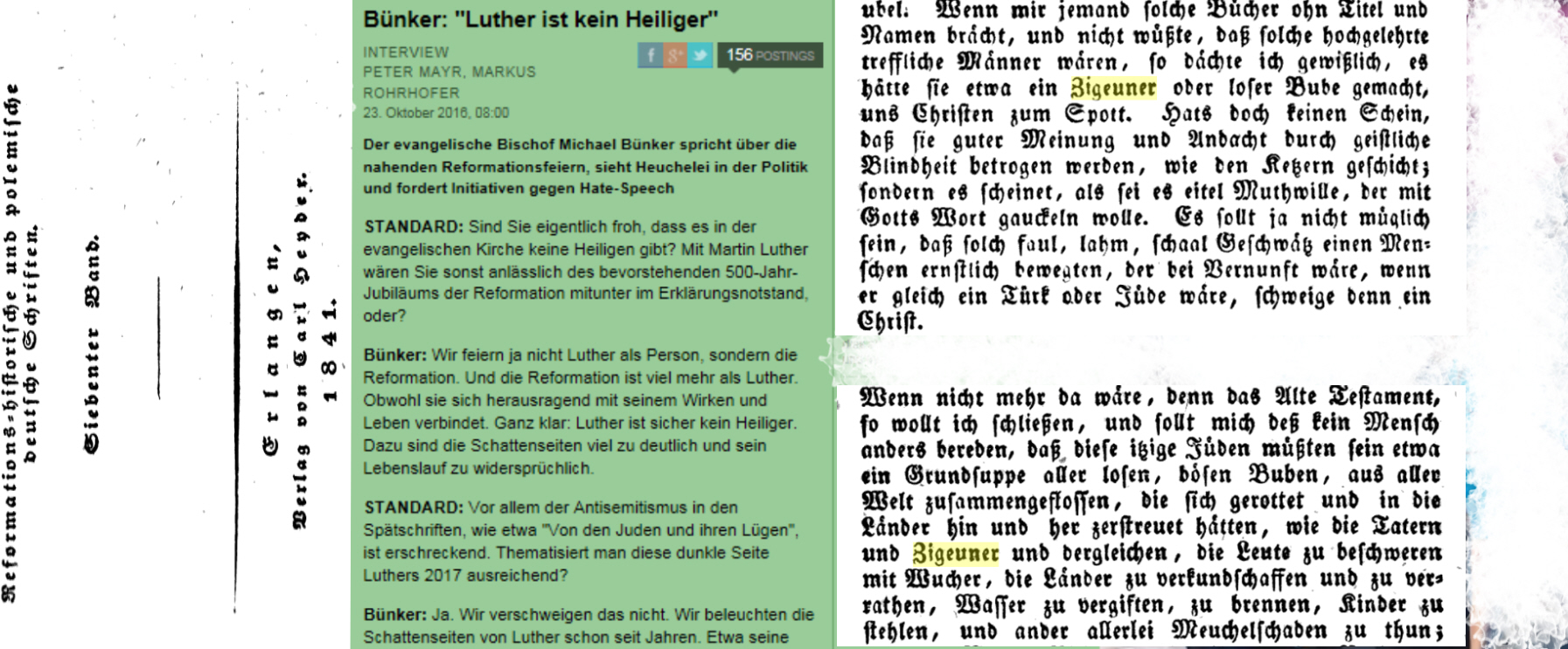 Diese Sätze wissen um die anderen Sätze, die geschrieben werden, und sie dauern sie, daß sie so geschrieben werden, wie etwa jene in der sogenannten Qualitätszeitung, die für viele der Standard österreichischer Qualitätszeitungen ist. Wie können noch die europaweit bedrohten Menschen unerwähnt bleiben, wenn von dem Antisemitismus des Martin Luther gesprochen wird? Sogar dann, wenn diese eine lutherische Schrift, wie in der Collage gelesen werden kann, explizit angesprochen wird, in der Luther davon schreibt, den Juden möge es wie den „Zigeunern“ … Sind denn nicht gerade die Opfer, die Opfer durch Jahrhunderte waren, und heute weiter Opfer sind, zu dem auch Luder beitrug, an erster Stelle zu nennen, als die Leidenden von heute?