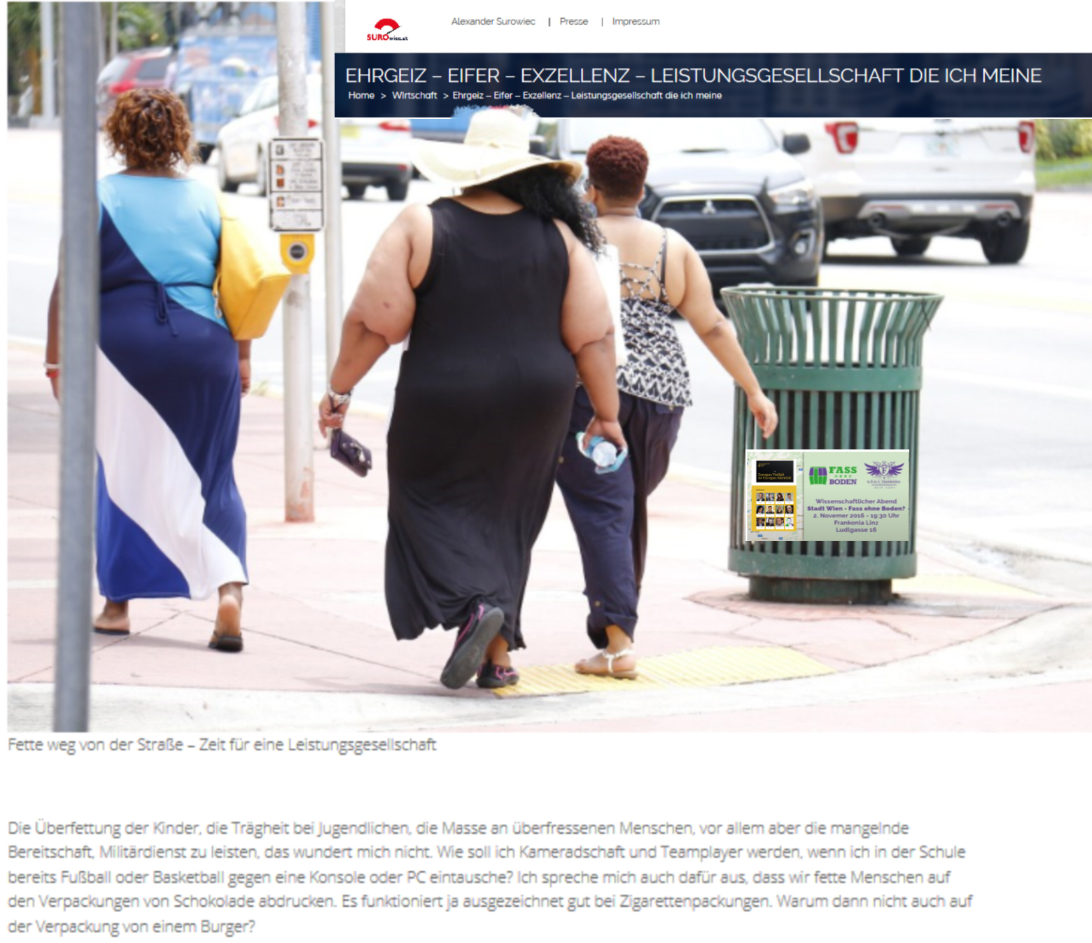 Das aber schade ist. Wer hätte nicht gerne gehört eine derart hochkarätige Vision, die auf einen so einfachen Nenner von ihm gebracht wird: „Fette weg von der Straße“. Er scheint aber die „neue Leistungsgesellschaft“ nicht in seiner unmittelbaren Umgebung gegründet haben zu wollen, sondern nach seinem Bild, mit dem er seinen Slogan illustriert, in einem fernen Land …
