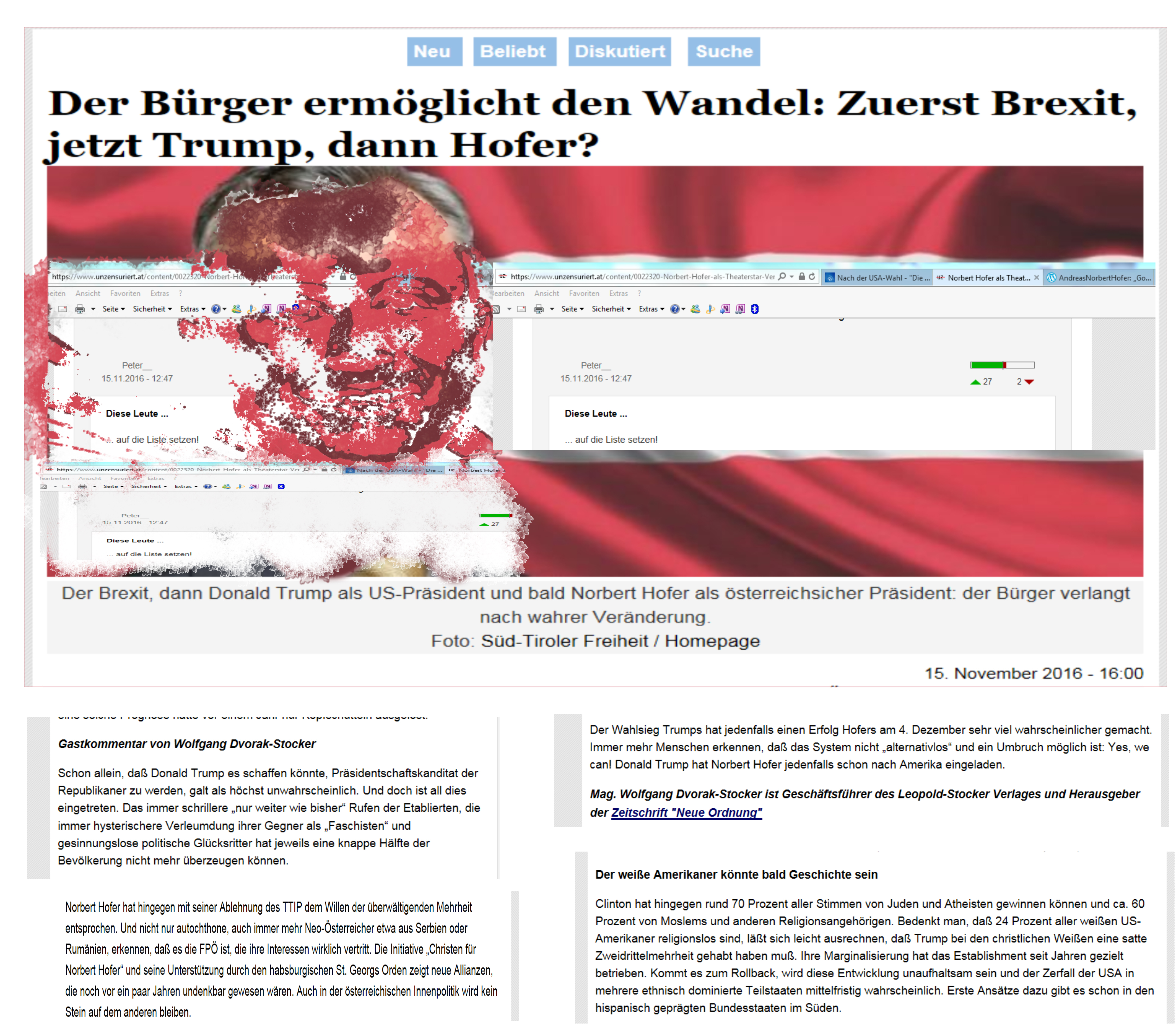 Wolfgang Dvorak-Stocker zu sein, der am 15. November 2016 schreibt: „Der Bürger ermöglicht den Wandel: Zuerst Brexit, jetzt Trump, dann Hofer?“ Er schreibt einen „Gastkommentar“. Vielleicht wird er eines Tages erklären, er habe bloß „Gastkommentare“ auf FPÖ unzensuriert geschrieben, und dabei soll vergessen werden, daß sein Unternehmen an ihr beteiligt …