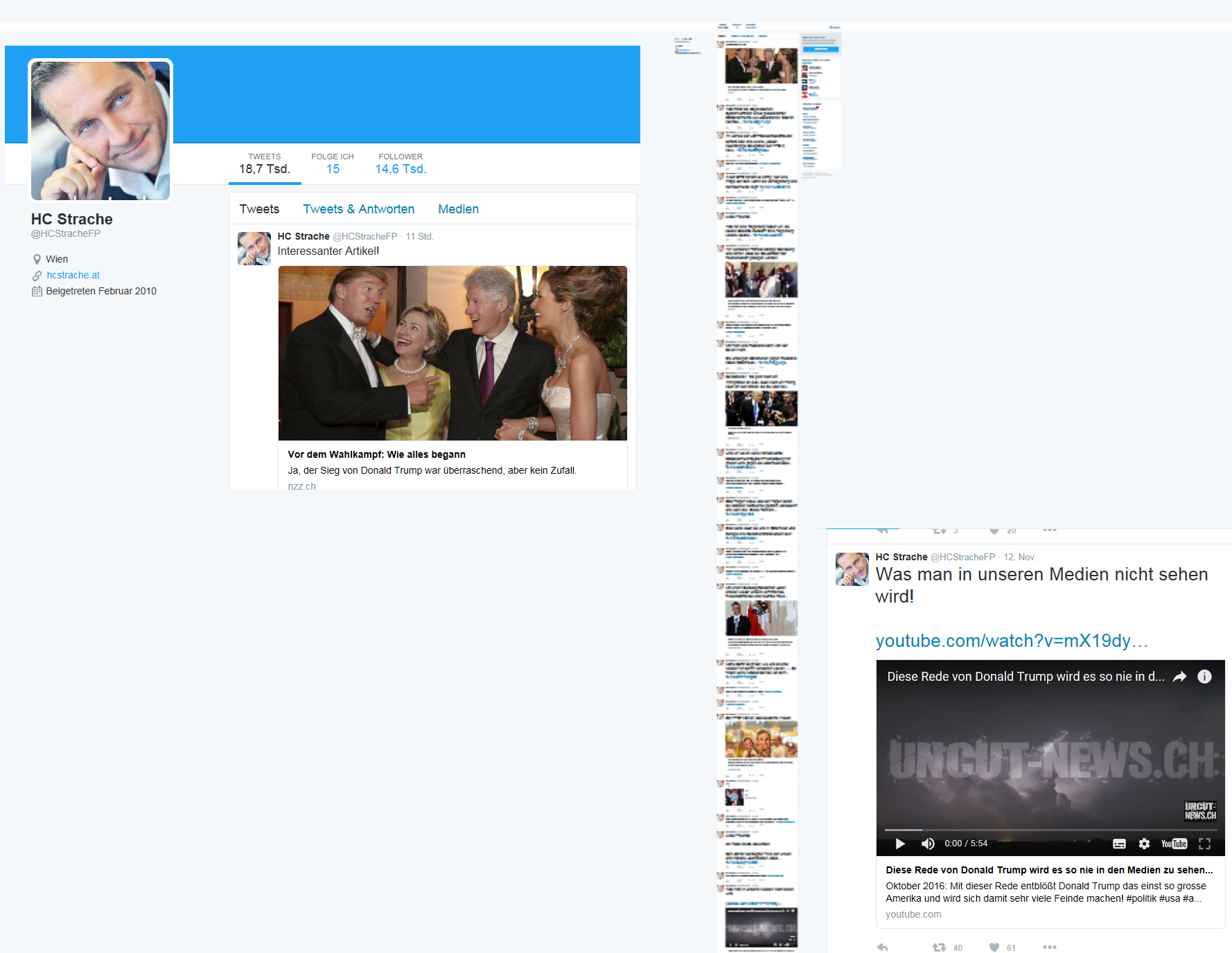Auf der Plattform des Unternehmens Twitter scheint He.-Chr. Strache keine Mitarbeiter oder vielleicht auch Mitarbeiterinnen zu haben. Denn, wie in der Collage gelesen werden kann, ist das Uncut-News-Werbetrumpvideo auch weiterhin, 16. November 2016, veröffentlicht. He.-Chr. Strache löscht also nicht.