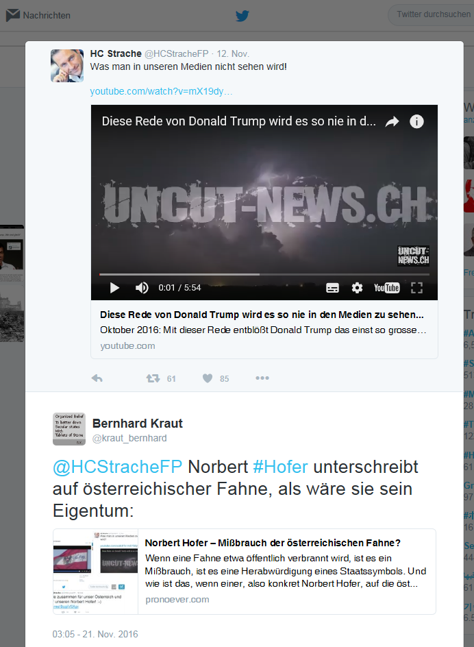NNS Auf der Plattform des Unternehmens Twitter chräht der Mann neben Hofer, wie in der Collage gelesen werden kann, „alle zusammen für unser Österreich“ … wie ungeteilt das klingt, aber so ungeteilt ist es nicht, gerade was die Verantwortung betrifft. Aber das muß nicht noch einmal ausgeführt werden. Hierzu genügend im Zusammenhang mit der Verbreitung von „Uncut-News“