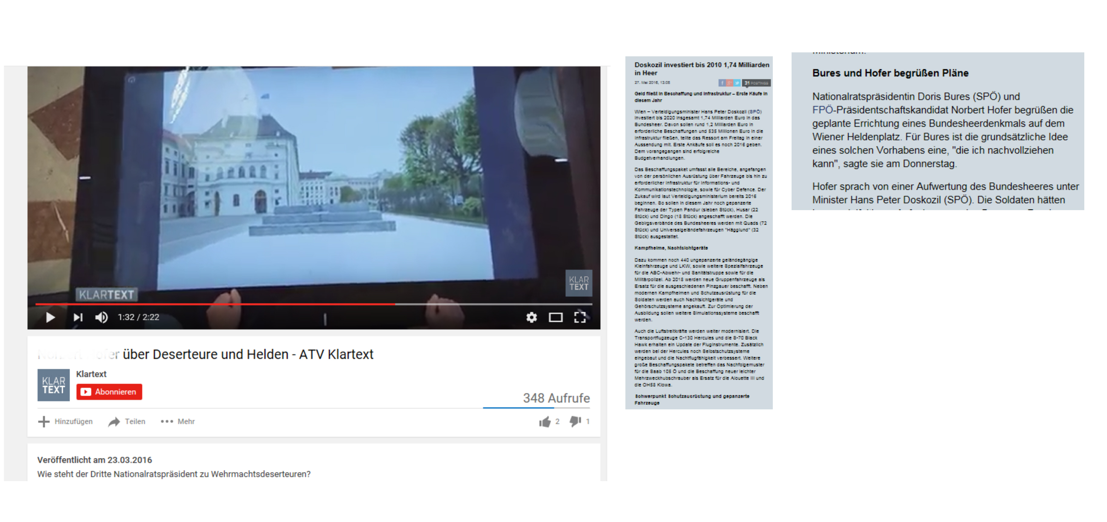 Es zeigt bloß auf, wie skrupellos Menschen, die ohnehin nichts haben, sogar dann, wenn sie arbeiten, noch das genommen werden will und genommen wird, während gleichzeitig der derzeitige Verteidigungsminister Steuergeld allein in Höhe von 1,7 Milliarden Euro für Geräte … die dann verrotten und wie auch oder für enorm viel Steuergeld wieder aus den Äckern und Seen … Er möchte auch ein weithin sichtbares militärisches Denkmal errichten – angenommene Steuergeldkosten dafür etwa in der Höhe von den Entsorgungskosten von fünf Fliegerbomben … Wenn die weltweite Erfolgsgeschichte des Militärs bedacht wird, ist der Wunsch nach einem Militärdenkmal sehr verständlich … allein wie erfolgreich das Militär in Österreich in den letzten einhundert Jahren war, erfolgreich wirkte für das Wohl der Menschen, wer könnte es ihm verdenken, mit einem Militärdenkmal einmal Danke dafür zu sagen, in diesem an Militärdenkmälern so armen Land …