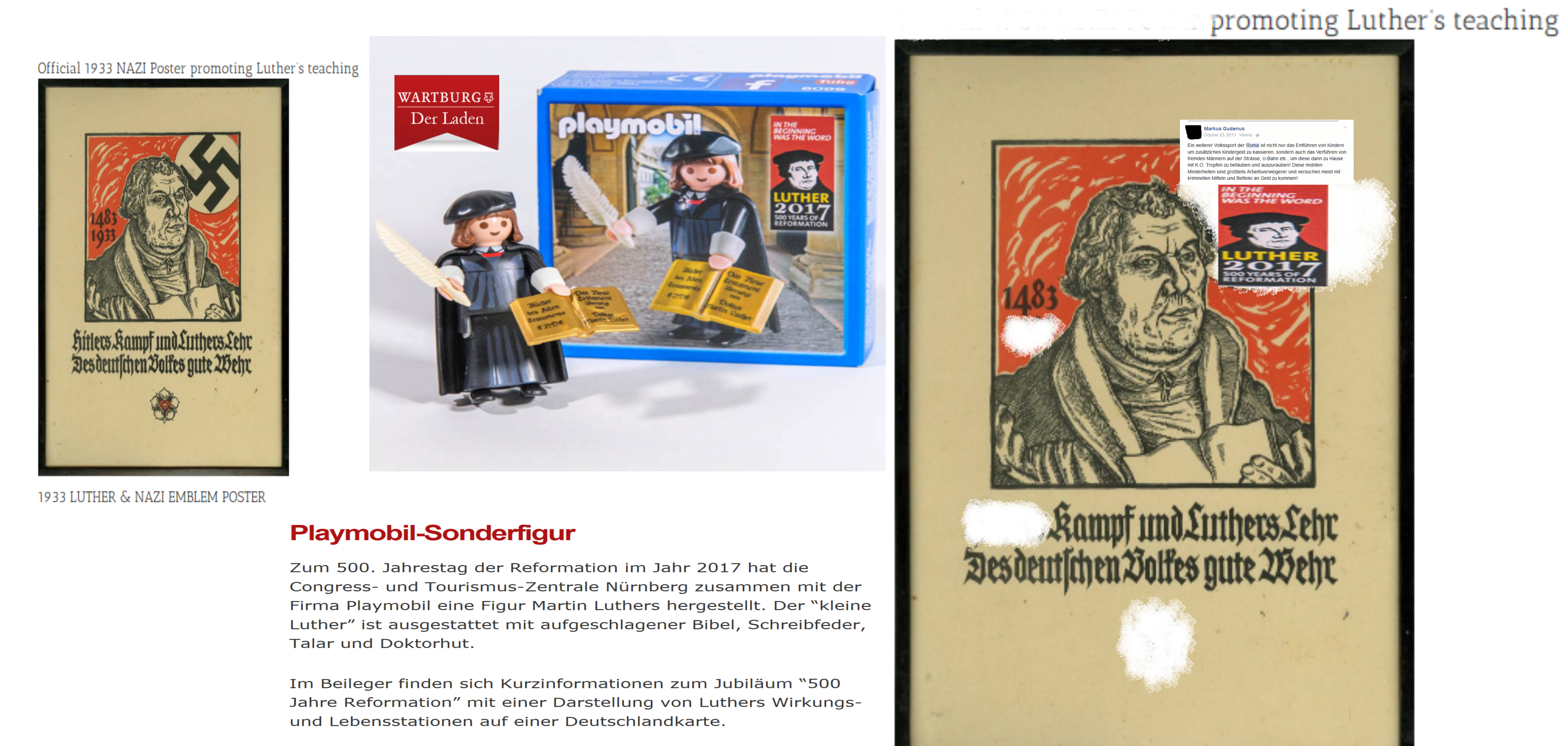 Wie gut wäre es, wenn die Propaganda der Nationalsozialisten und Nationalsozialistinnen wahr geworden wäre. Es also tatsächlich, wie auf dem Poster in der Collage zu lesen ist, das Verbreiten der Lehre von Martin Luther mit 1933 bereits und endgültig sein Ende gefunden hätte.