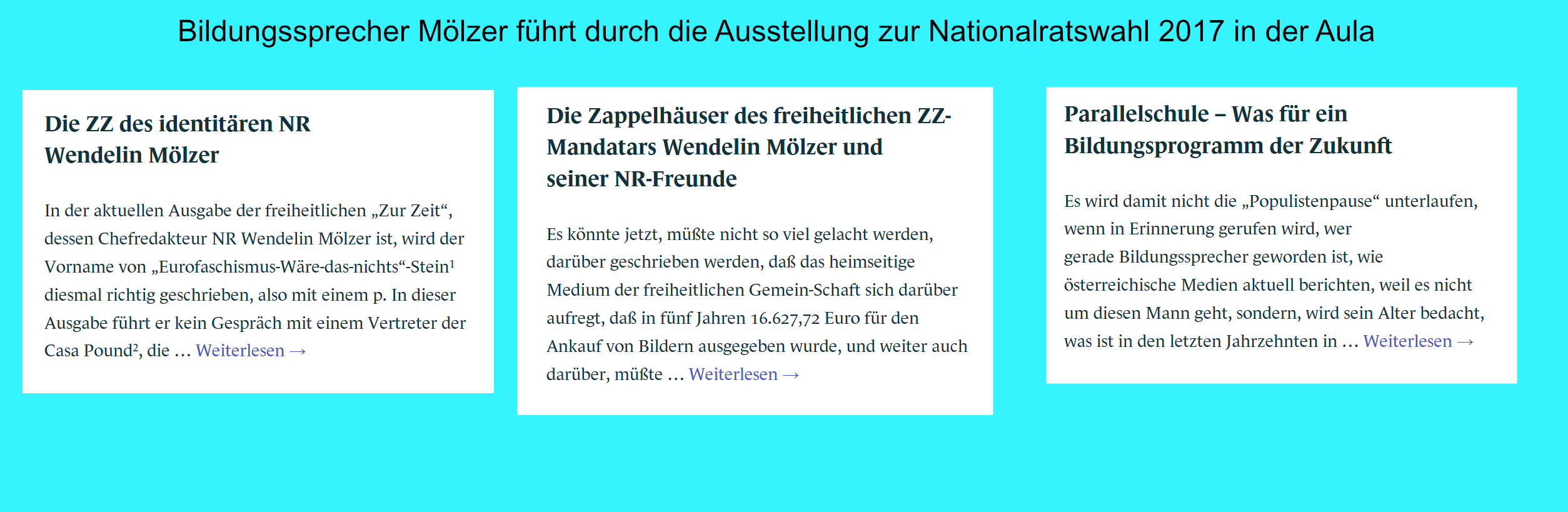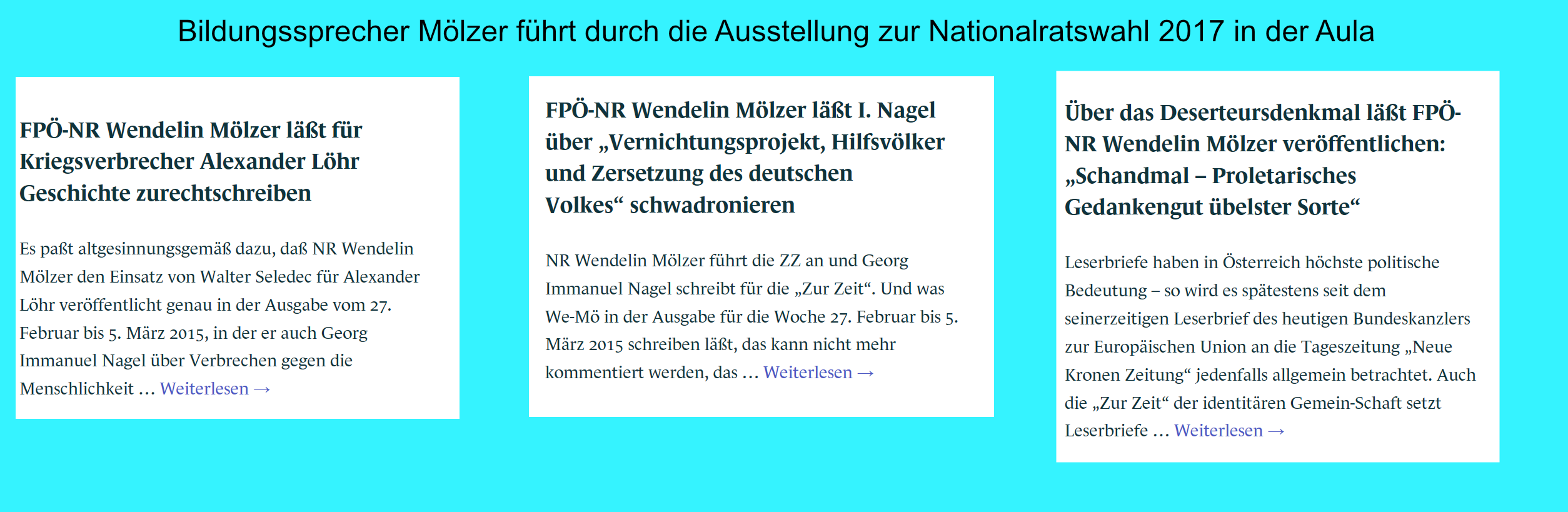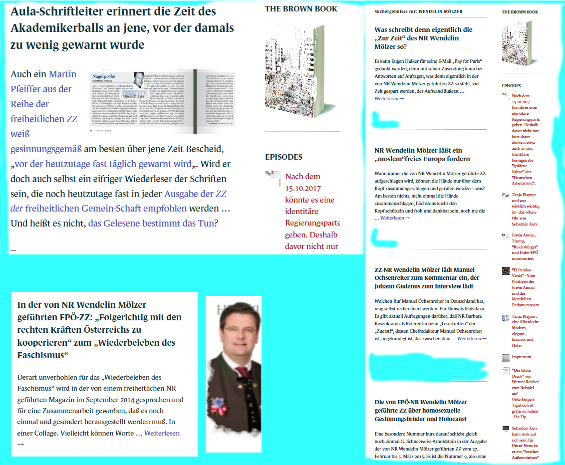 Der Bildungssprecher war für eine Zeit auch Chefredakteur des Magazins „Zur Zeit“. Warum nicht mehr? Erfolglosigkeit? Oder um sich ganz der gesinnungsgemäßen Bildung zu ergeben? Übrigens, aber dies nur nebenher: Anteile an diesem Magazin hält auch: Hübner schon wieder. Zurzeit scheint Walter Seledec der Chefredakteur zu sein, an dem Mölzer bei seinem erklärenden Gang durch die Aula auch vorbeiführen wird.