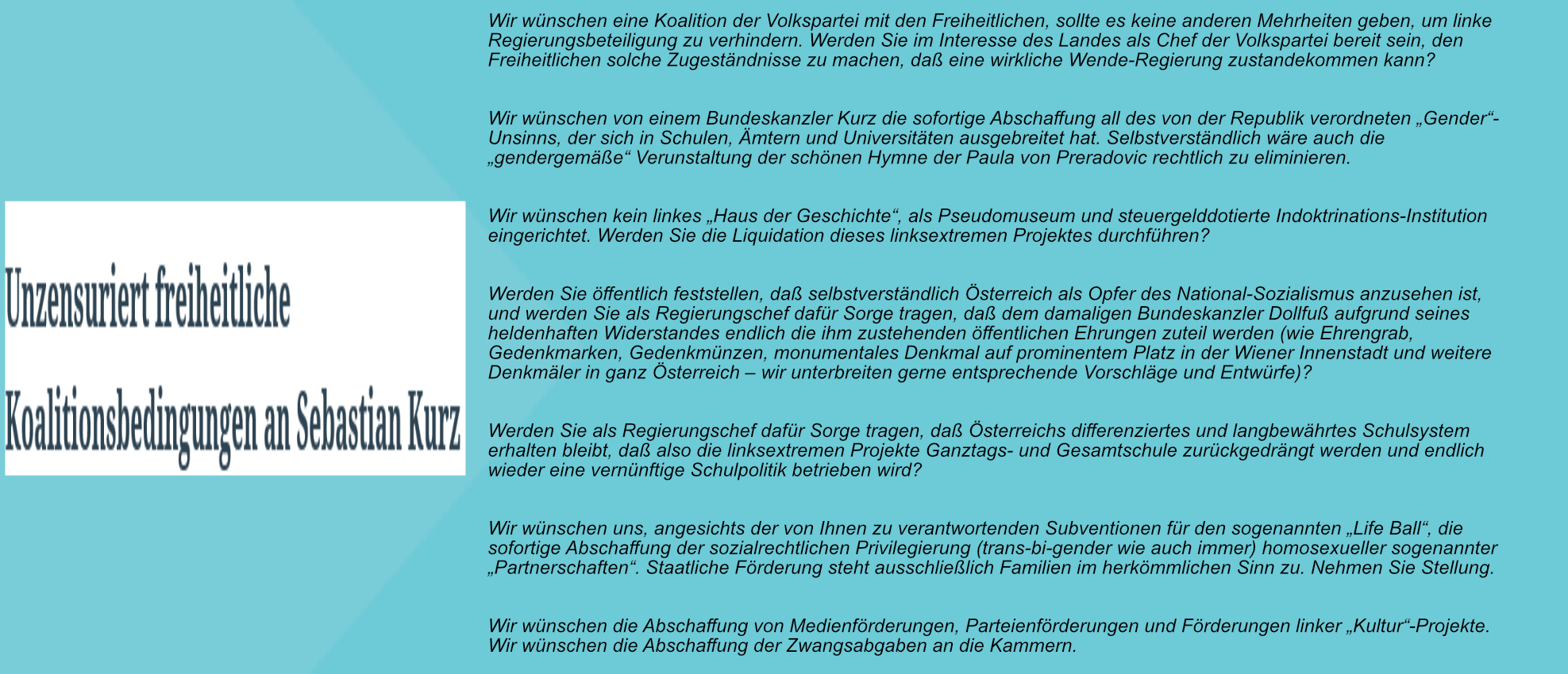 - Wir wünschen von einem Bundeskanzler Kurz die sofortige Abschaffung all des von der Republik verordneten „Gender“-Unsinns, der sich in Schulen, Ämtern und Universitäten ausgebreitet hat. Selbstverständlich wäre auch die „gendergemäße“ Verunstaltung der schönen Hymne der Paula von Preradovic rechtlich zu eliminieren.