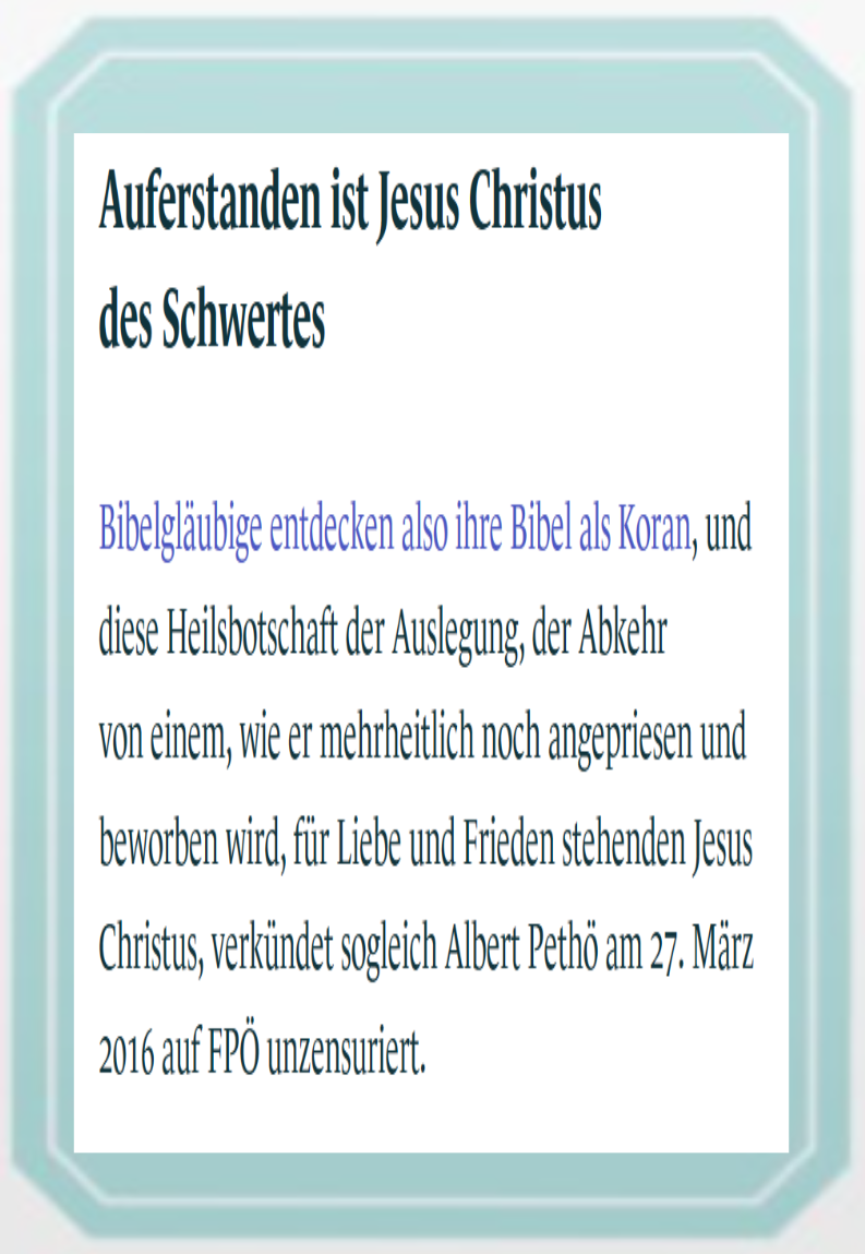 Wie kann Albert Pethö seine Koalitionsbedingungen so selbstbewußt vortragen? Nun, er weiß Jesus Christus hinter sich, genauer, nicht den Nächstenliebereklamejesus, sondern den für ihn wahren und ihm nachzufolgenden Christus des Schwertes, ebenfalls verkündet in der FPÖ unzensuriert:
