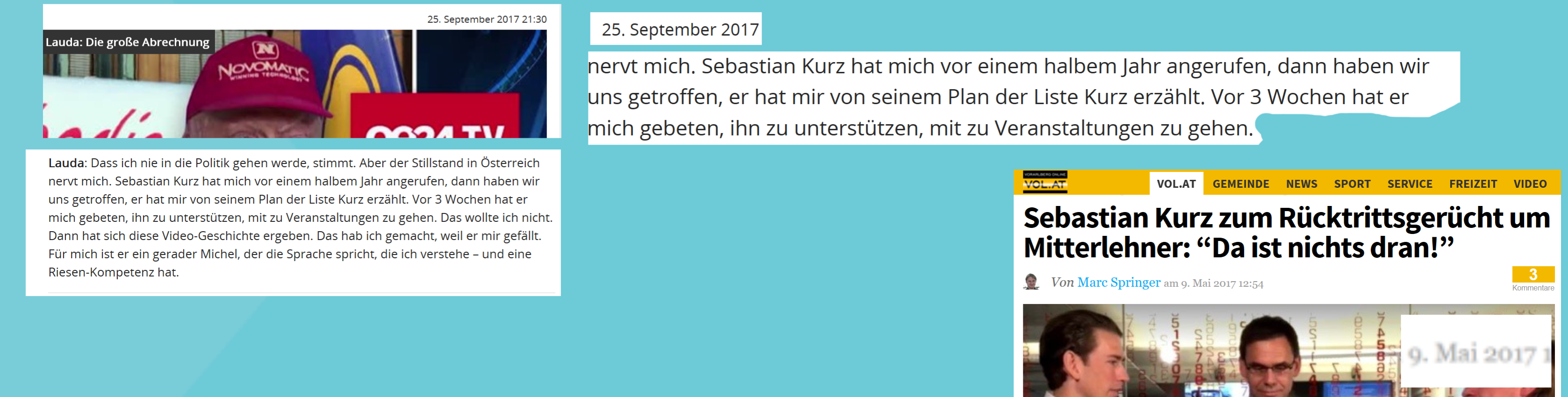 Wie dem Interview vom 25. September 2017 zu entnehmen ist, rief Sebastian Kurz vor „einem halben Jahr“ Niki Lauda an. Er, Kurz, weihte dann Niki Lauda persönlich bei einem Treffen in seinen „Plan“ einer „Liste Kurz“ ein.