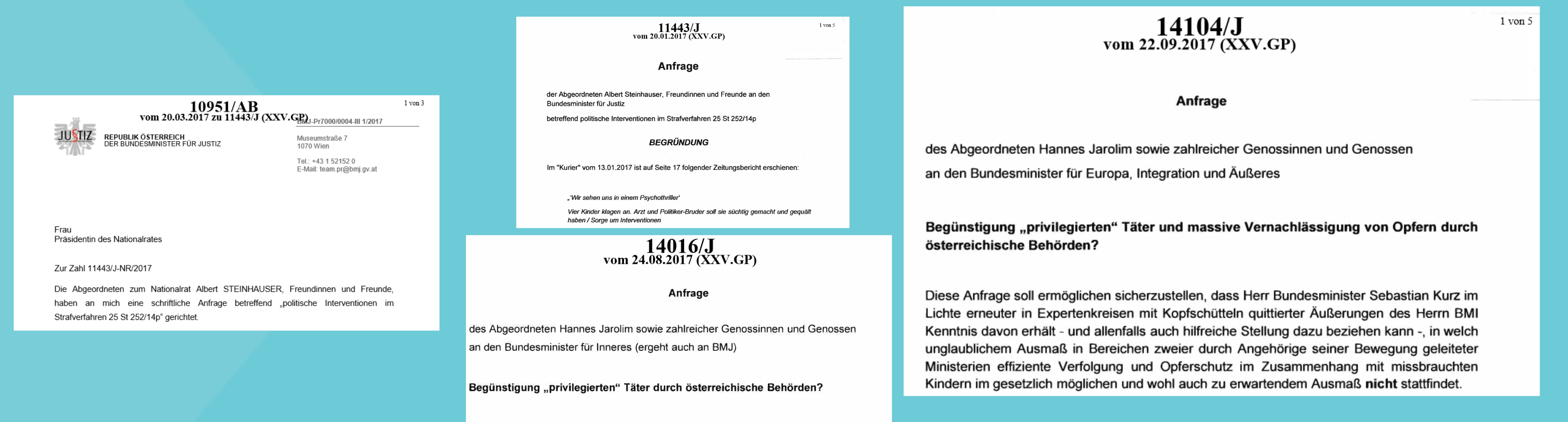 „Diese Anfrage soll ermöglichen sicherzustellen, dass Herr Bundesminister Sebastian Kurz im Lichte erneuter in Expertenkreisen mit Kopfschütteln quittierter Äußerungen des Herrn BMI Kenntnis davon erhält – und allenfalls auch hilfreiche Stellung dazu beziehen kann -, in welch unglaublichem Ausmaß in Bereichen zweier durch Angehörige seiner Bewegung geleiteter Ministerien effiziente Verfolgung und Opferschutz im Zusammenhang mit missbrauchten Kindern im gesetzlich möglichen und wohl auch zu erwartendem Ausmaß nicht stattfindet.“