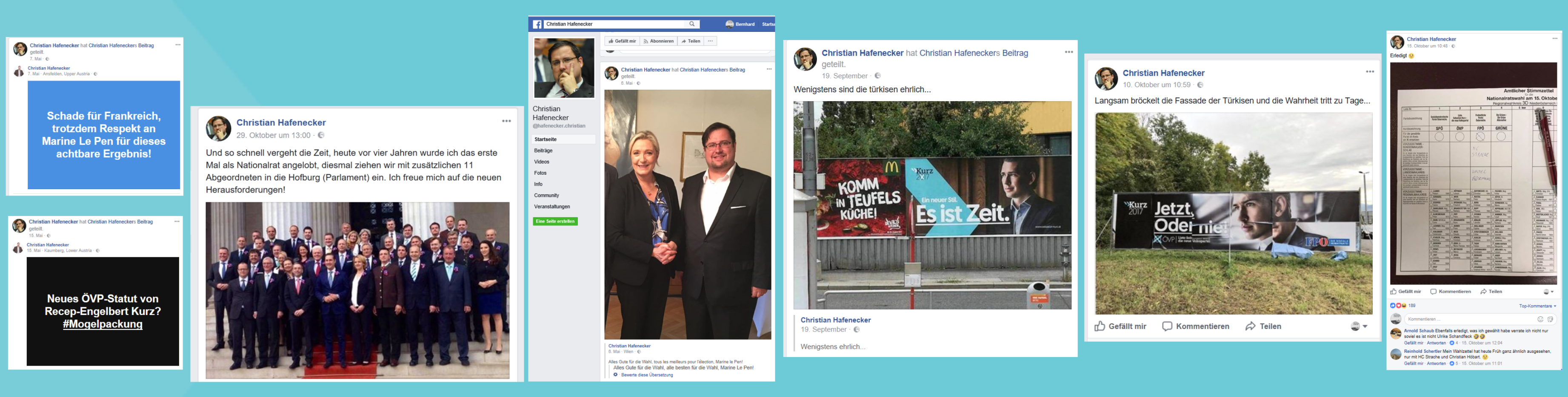 Wie in der Collage gelesen werden kann, sind es nicht gerade Freundlichkeiten, die Christian Hafenecker auf der Plattform des Unternehmens Facebook gegen die ÖVP und gegen Sebastian Kurz … und das nicht vor Jahren, sondern, kurz gesagt, am Vorabend des Eintritts in Verhandlungen zu einer gemeinsamen Regierung von ÖVP und FPÖ …