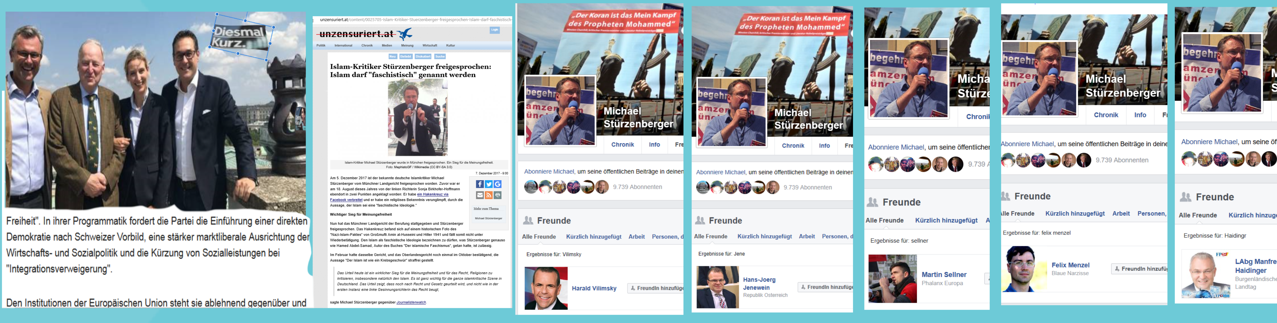 Wie in der Collage gelesen werden kann, hat Michael Stürzenberger auf der Plattform des Unternehmens Facebook recht besondere Freunde, auch aus Österreich.