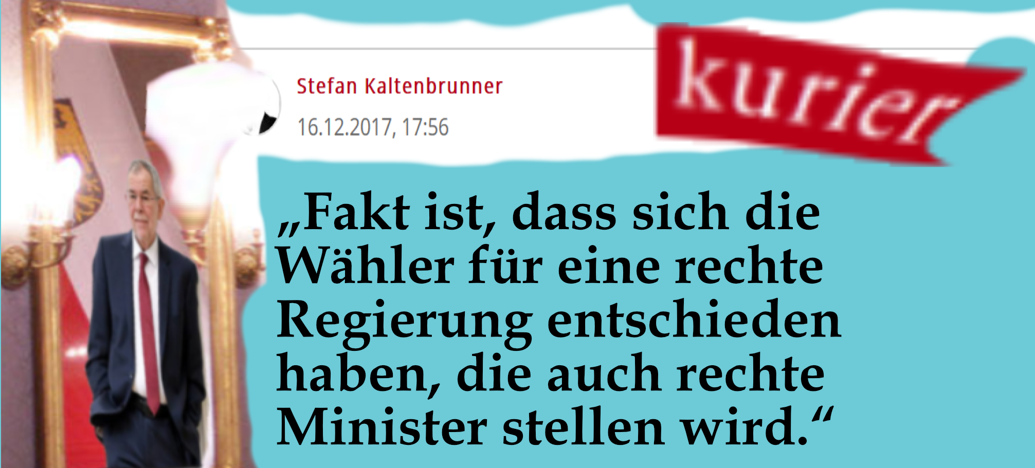 Das schreibt Stefan Kaltenbrunner am 16. Dezember 2017 in der Tageszeitung „Kurier“. Also eine weitere Zeitung, die Wählern und Wählerinnen schon am Beginn, ehe Alexander Van der Bellen sein Montagprodukt vollendet haben wird, die Verantwortung für diese Regierung zuschiebt, die Schuld an dieser Regierung anlastet.