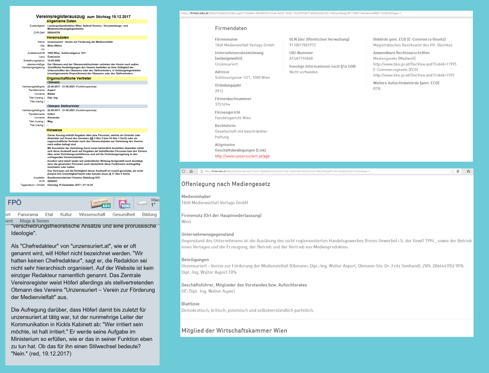 Nun hat – ebenfalls WKO-Firmenauskunft – plötzlich der Verein Unzensuriert 90 Prozent und Asperl 10 Prozent, wie in der Collage gelesen werden kann. Und in dieser Firmenauskunft taucht als Obmann-Stellvertreter Dr. Fritz Simhandl auf, der im Vereinsregisterauszug nicht genannt ist (Stand 19. Dezember 2017).