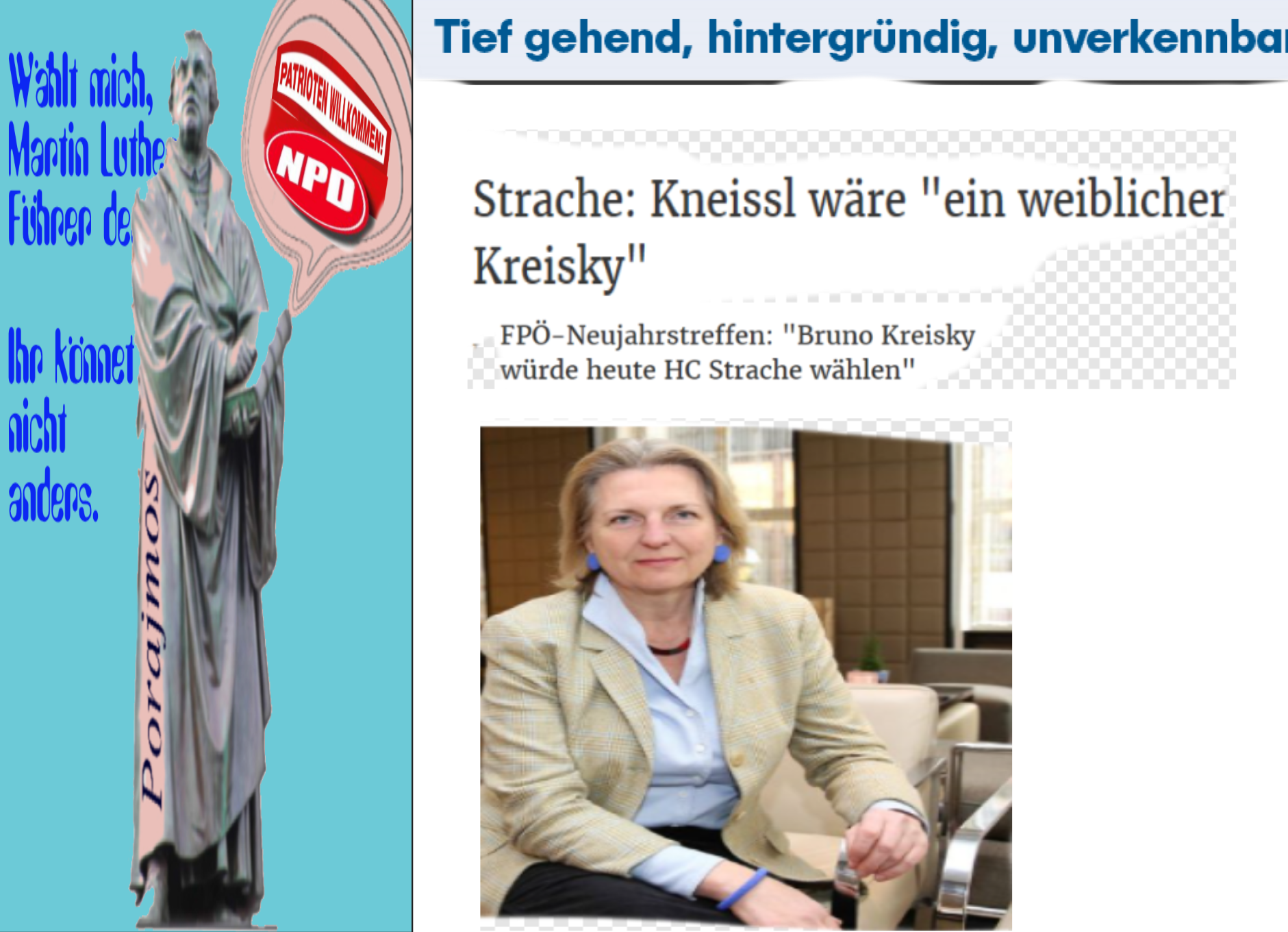 Die NPD in Deutschland hat für ihre Dümmelei, wer sie wählen würde, wenigstens eine Person genommen, die gesinnungsgemäß zu ihr paßt. Der Vizekanzler der FPÖ in Österreich hat für seine Dümmelei, wer seine identitäre Partei wählen würde, eine zu ihm und zu seiner identitären Partei ganz und gar nicht gesinnungsgemäß passende Persönlichkeit mißbraucht.