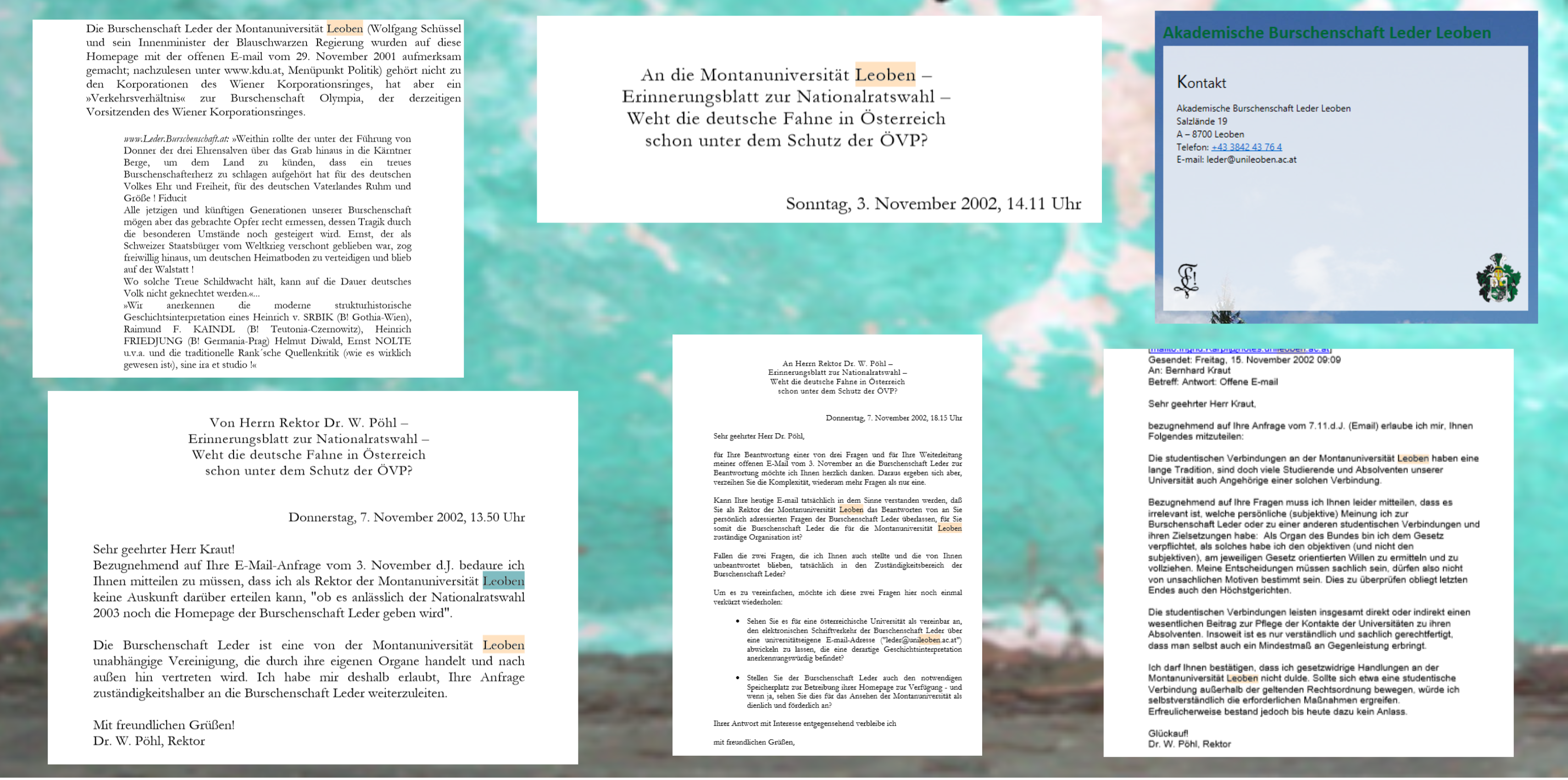 Die Burschenschaft Leder ist eine von der Montanuniversität Leoben unabhängige Vereinigung, die durch ihre eigenen Organe handelt und nach außen hin vertreten wird. Ich habe mir deshalb erlaubt, Ihre Anfrage zuständigkeitshalber an die Burschenschaft Leder weiterzuleiten. Mit freundlichen Grüßen! Dr. W. Pöhl, Rektor