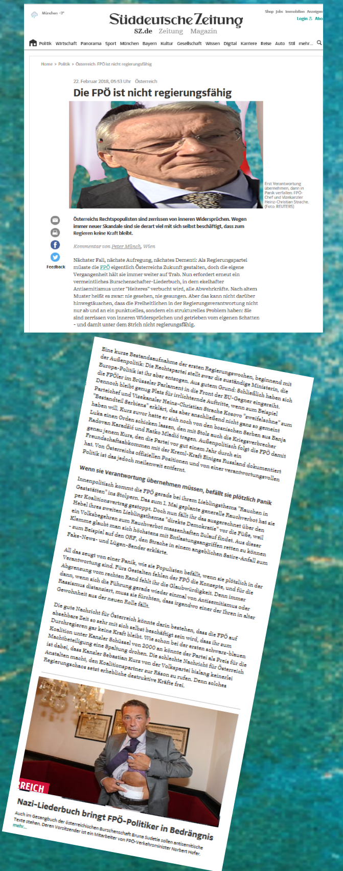 Österreich von 2000 bis 2018, Österreich im 21. Jahrhundert: Von Regierungsunfähigkeit bis Regierungsunfähigkeit der FPÖ, von Regierungsunwürdigkeit bis Regierungsunwürdigkeit der FPÖ. In einem anderen Land, in einem anderen Staat wäre das keine große Sache, eine Partei, die regierungsunfähig und regierungsunwürdig ist, zu haben. Es wäre eine von diesen Nullkommaachtprozentparteien, bedeutungslos und ein Beleg für eine funktionierende Demokratie. In Österreich hingegen wählen Menschen eine solche regierungsunfähige und regierungsunwürdige Nullkommaachtprozentpartei zu einer potentiellen Regierungspartei. In Österreich hingegen sagt die Elite, so eine Nullkommaachtprozentpartei muß regieren, macht die sogenannte Elite aus eine regierungsunfähigen eine für sie regierungsfähige Partei.