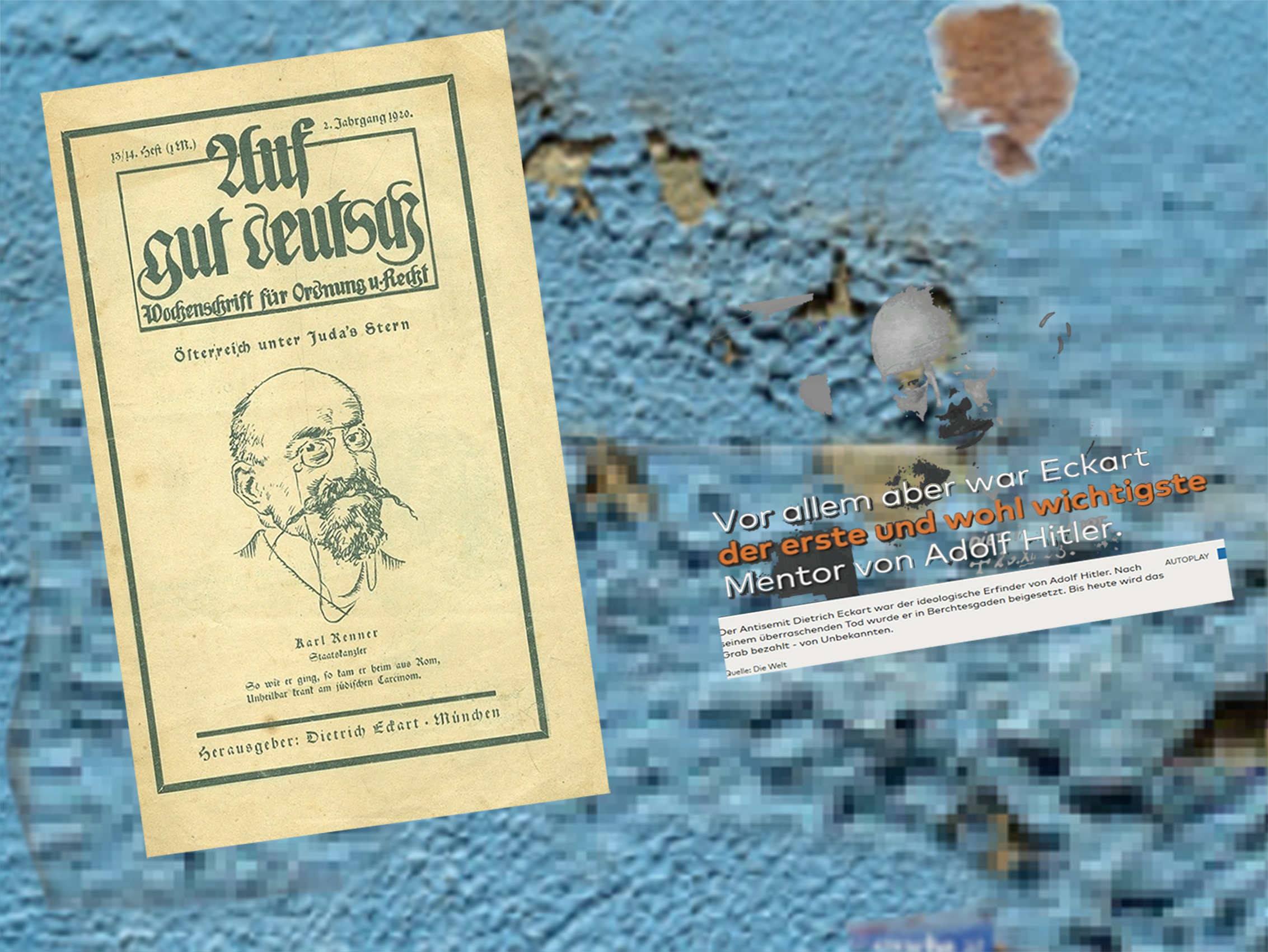 Eckart in der Fuhrmanngasse – an die Gegenwart im Gedenkjahr 2018 erinnern, wer Eckart war, ein Mann, dem Adolf Hitler seinen in ein Buch eingeschweißten „Kampf“ widmete … wem auch sonst? Eckart, der Mann der Forderungen wußte: „Juda, verrecke“ …
