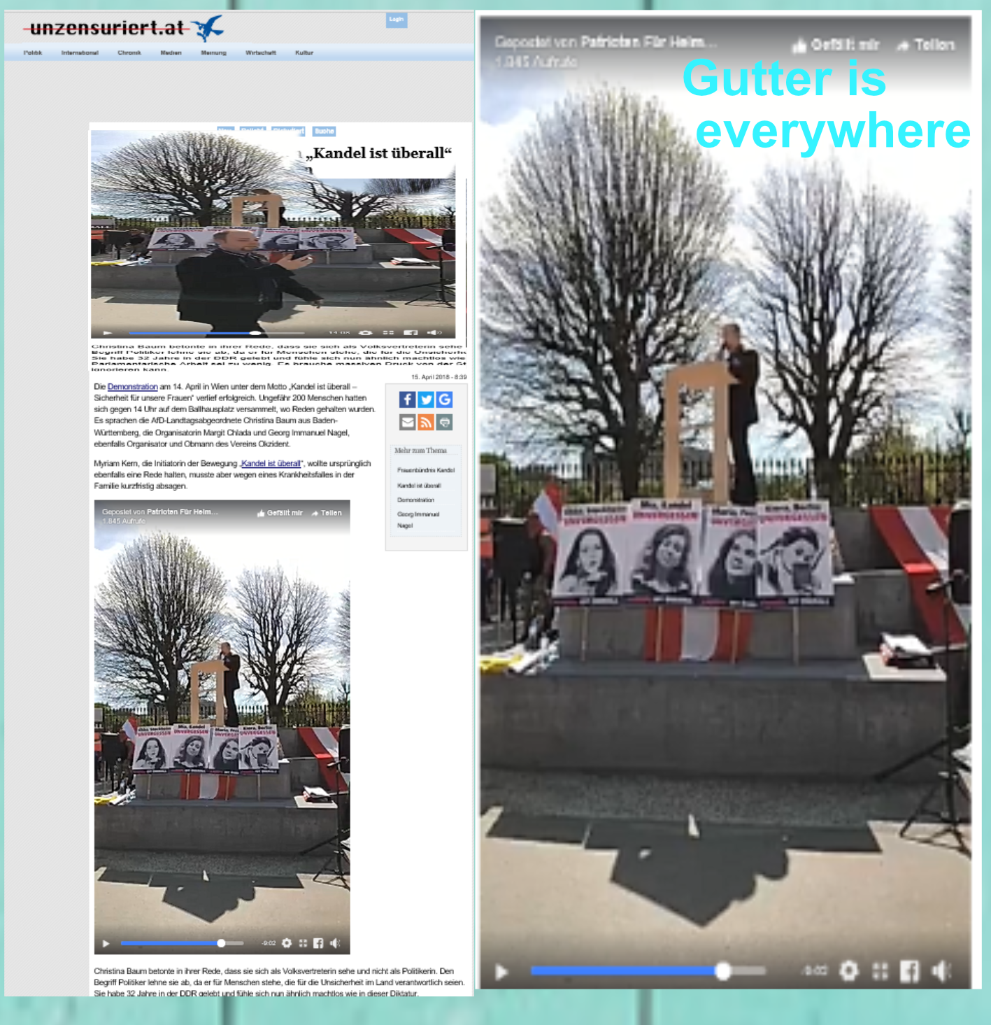 Übrigens. Es muß eingestanden werden, der Sinn des Titels erschließt sich nicht. Was für eine Art von „Kandel“ wurde von den Demonstrantinnen gemeint? Milchkandel? Milchkandel ist überall? Dachkandel? Dachkandel ist überall? Haben die Demonstranten diesen Spruch aus dem Englischen übernommen? Gutter is everywhere. Und eigenwillig übersetzt. Eine stimmigere Übersetzung mit dem Wort everywhere wäre wohl: Gosse ist überall oder Schmutz ist überall …