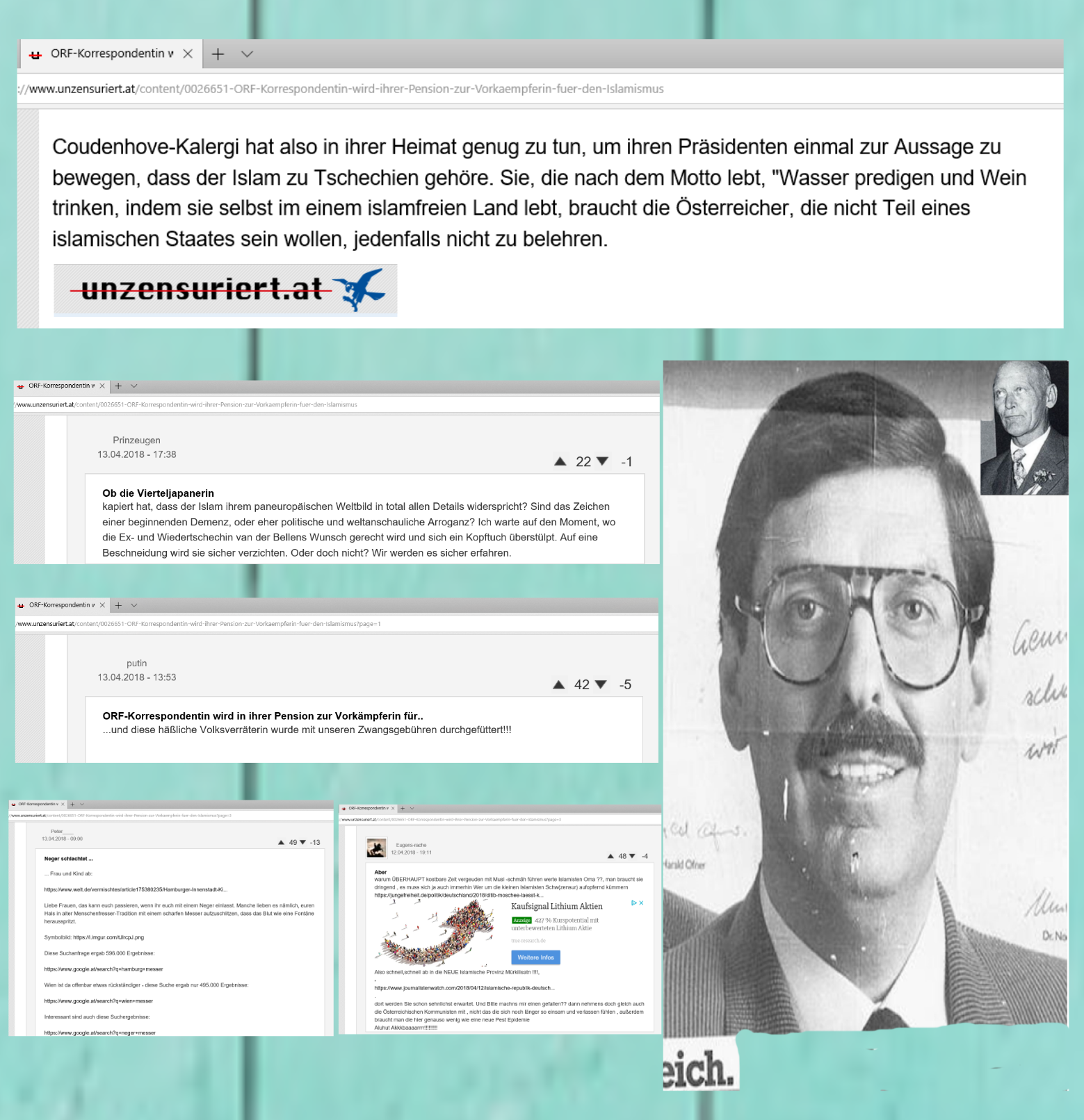 In einem Kommentar, wie in der Collage ebenfalls zu lesen ist, am 12. April ’18 auf der Website der identitären Regierungspartei wird ihm, Honsik, der „zur grossen Armee hinüber gegangen“, gedankt für „deinen lebenslangen Einsatz für unser Volk“ … von einem oder einer, die sich „politisch Verfolgter“ nennt und sich – wie zutreffend – mit einem Foto von Jörg Haider präsentiert …