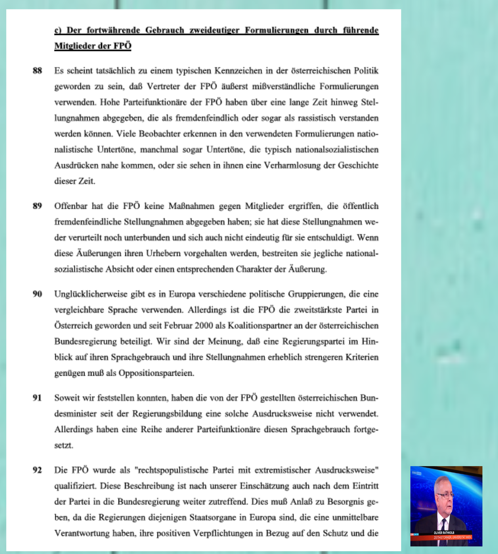 „Die Entwicklung der politischen Natur der FPÖ von einer rechtspopulistischen Partei mit extremistischer Ausdrucksweise zu einer verantwortungsvollen Regierungspartei ist nicht ausgeschlossen. Allerdings ist eine solche Entwicklung aufgrund der relativen kurzen bisherigen Erfahrungen nicht klar erkennbar.“