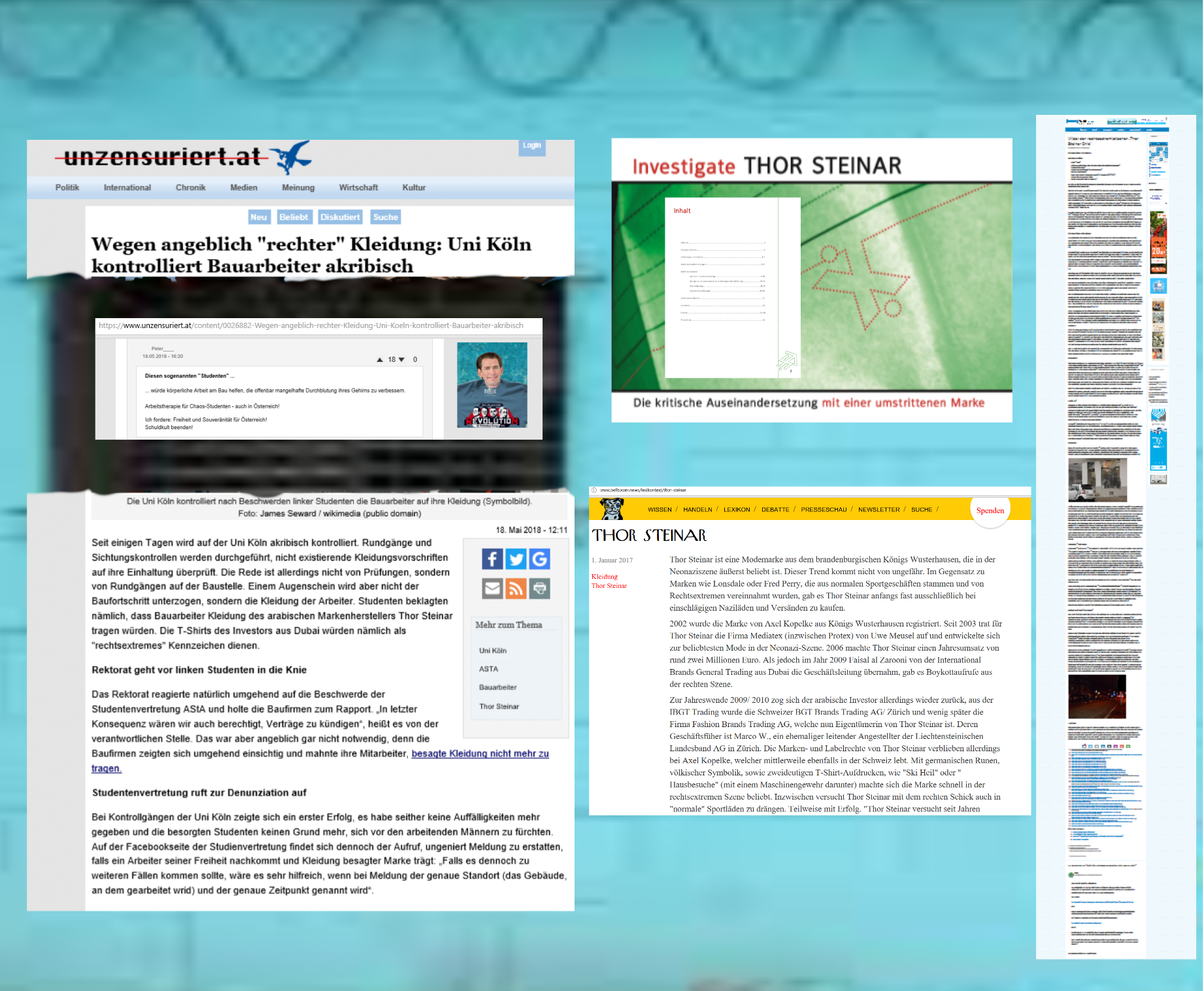 [s]eit einigen Tagen wird auf der Uni Köln akribisch kontrolliert. Rundgänge und Sichtungskontrollen werden durchgeführt, nicht existierende Kleidungsvorschriften auf ihre Einhaltung überprüft. Die Rede ist allerdings nicht von Prüfungen, sondern von Rundgängen auf der Baustelle. Einem Augenschein wird aber nicht der Baufortschritt unterzogen, sondern die Kleidung der Arbeiter. Studenten beklagten nämlich, dass Bauarbeiter Kleidung des arabischen Markenherstellers Thor Steinar tragen würden. Die T-Shirts des Investors aus Dubai würden nämlich als „rechtsextremes“ Kennzeichen dienen.