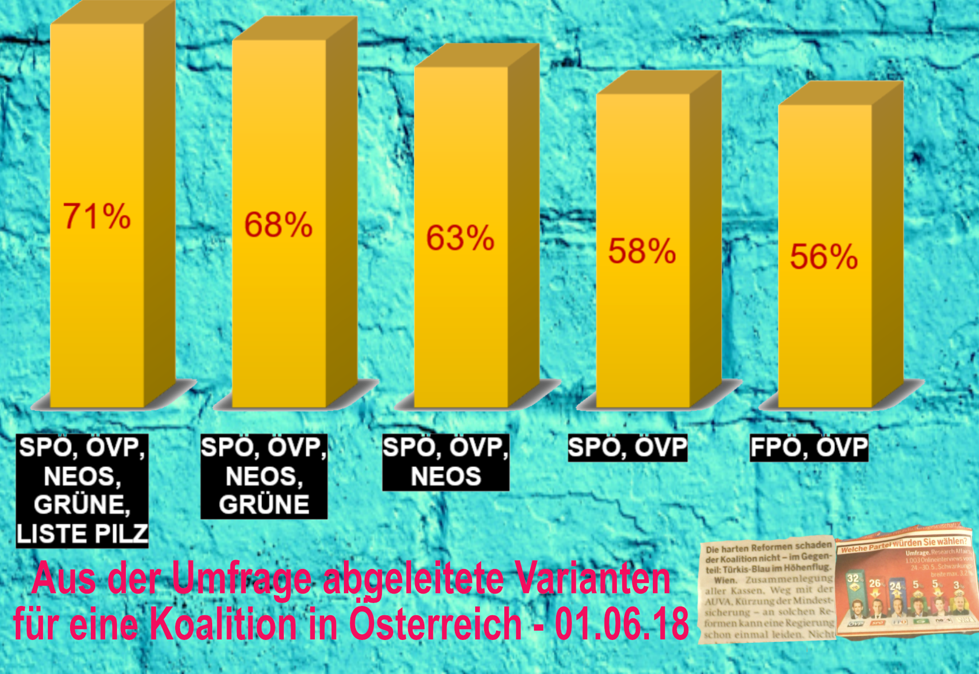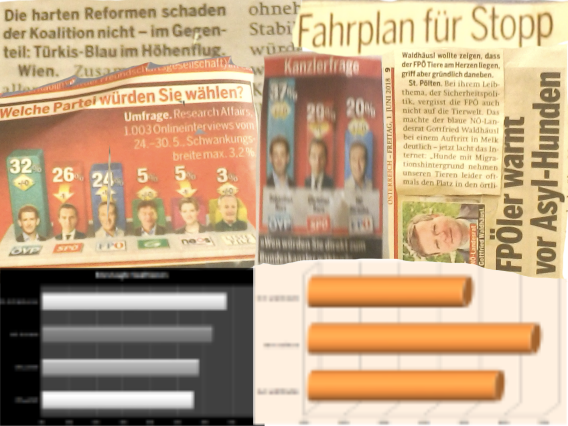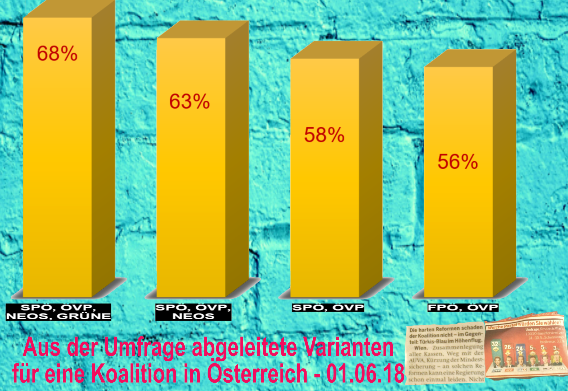 Seit der Nationalratswahl im Oktober ’17 bis zu der am 1. Juni 2018 veröffentlichten Umfrage der Umsonst ist eines unverändert: die Koalition von ÖVP und FPÖ ist bei weitem nicht die erste Wahl der Menschen in Österreich, sondern die letzte.
