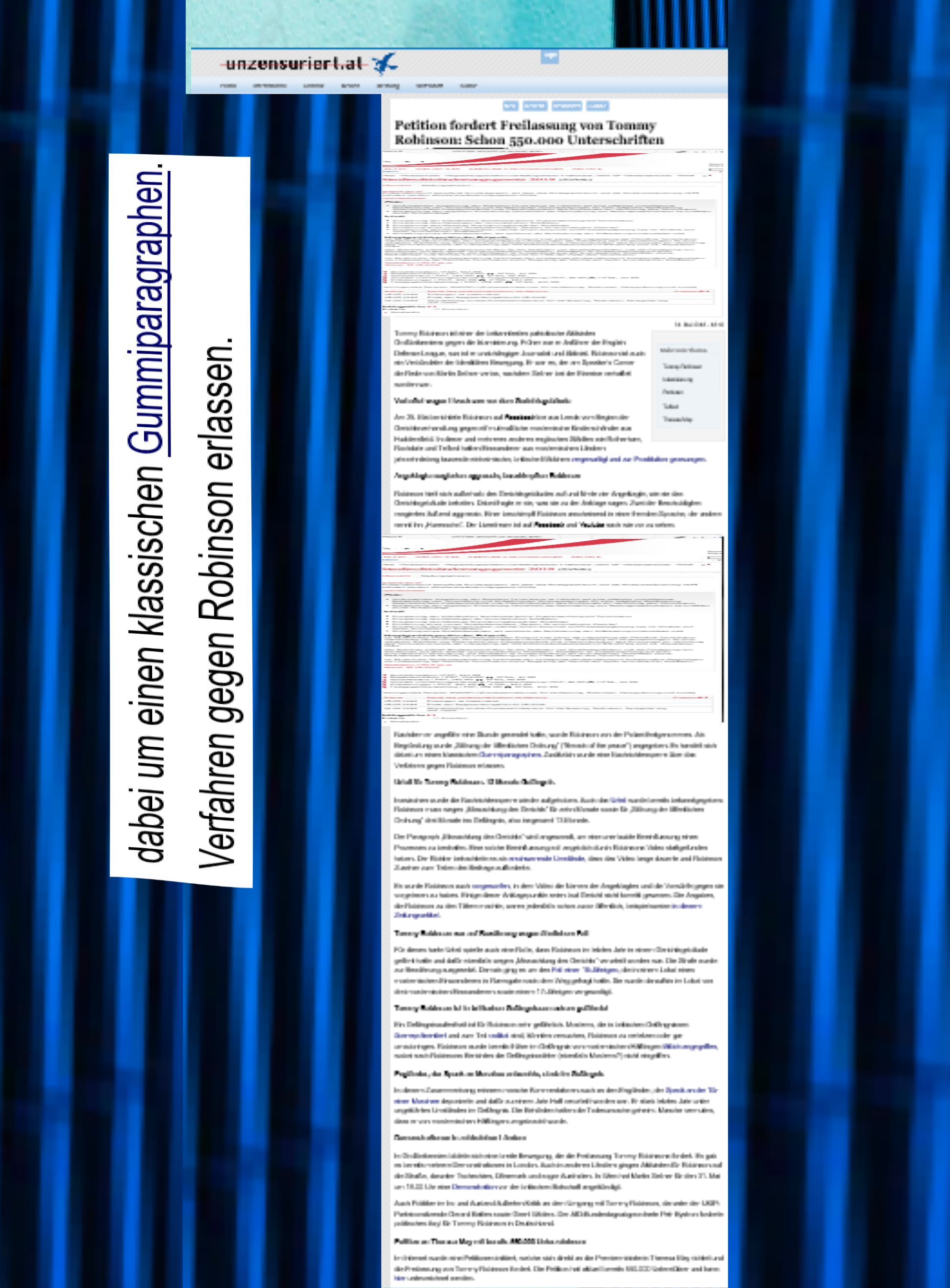 In den Paragraph 64 soll, so steht es in dem Entwurf, auch aufgenommen werden die „Gutheißung terroristischer Straftaten“. Diese Formulierung kommt auch schon vor im Paragraphen 282. Um ein eben erst von der gesinnungsgemäß zensierten Website der identitären Regierungspartei verwendetes Wort dafür zu zitieren: „Gummiparagraphen“. Die Website bringt dieses Wort im Zusammenhang mit ihrer Verbreitung der Petition „Set him free“, also sie unterstützt Tommy Robinson …