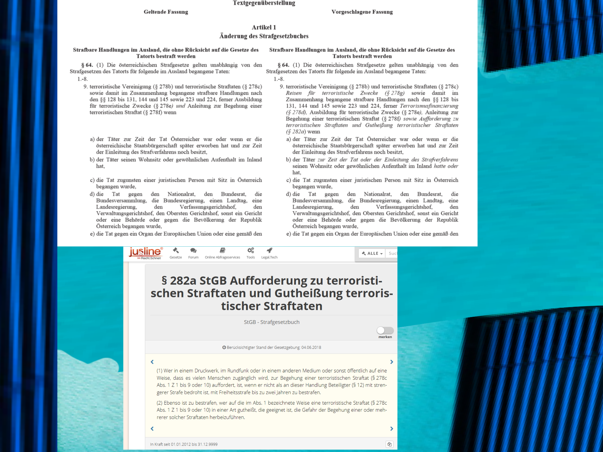 „§ 64. (1) Die österreichischen Strafgesetze gelten unabhängig von den Strafgesetzen des Tatorts für folgende im Ausland begangene Taten: terroristische Vereinigung (§ 278b) und terroristische Straftaten (§ 278c) Reisen für terroristische Zwecke (§ 278g) sowie damit im Zusammenhang begangene strafbare Handlungen nach den §§ 128 bis 131, 144 und 145 sowie 223 und 224, ferner Terrorismusfinanzierung (§ 278d), Ausbildung für terroristische Zwecke (§ 278e), Anleitung zur Begehung einer terroristischen Straftat (§ 278f) sowie Aufforderung zu terroristischen Straftaten und Gutheißung terroristischer Straftaten (§ 282a)[.]“