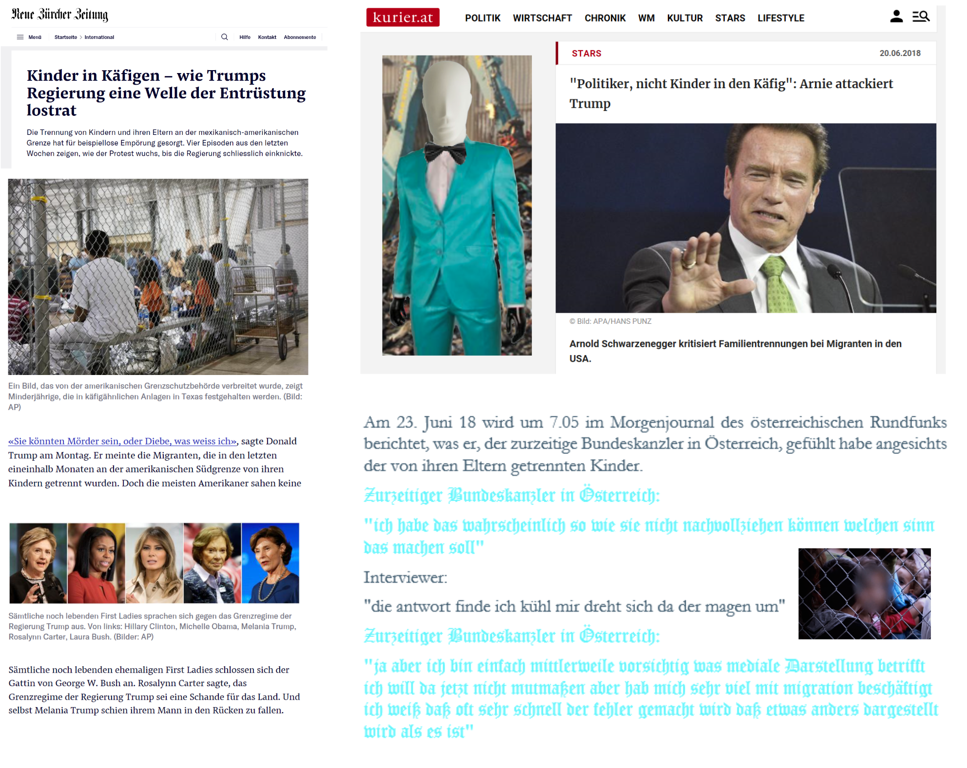 NS Es ist doch eine recht seltsame Wirklichkeitserfahrung, die der zurzeitige Bundeskanzler in Österreich ständig macht. Auch diesmal. Die Ehefrau des amerikanischen Präsidenten ist, nach seiner oben zitierten Aussage, ein „Medium“ – legt sie Karten oder schaut sie in die Kugel? Vorsichtig sei er bei „medialer Darstellung“ … auch die amerikanische Grenzschutzbehörde, die das Foto (in die Collage aufgenommen) der Kinder im Käfig veröffentlichte, ein Medium – materialisiert sie Kaffeesud?