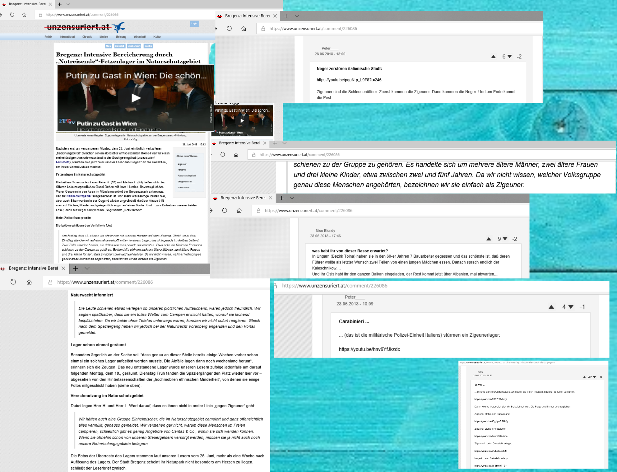 Das sind, wie in der Collage gelesen werden kann, Kommentare zum Kommentar „Bregenz: Intensive Bereicherung durch ‚Notreisende‘-Fetzenlager im Naturschutzgebiet“ der gesinnungsgemäß zensurierten Website der identitären Regierungspartei in Österreich am 28. Juni 18.